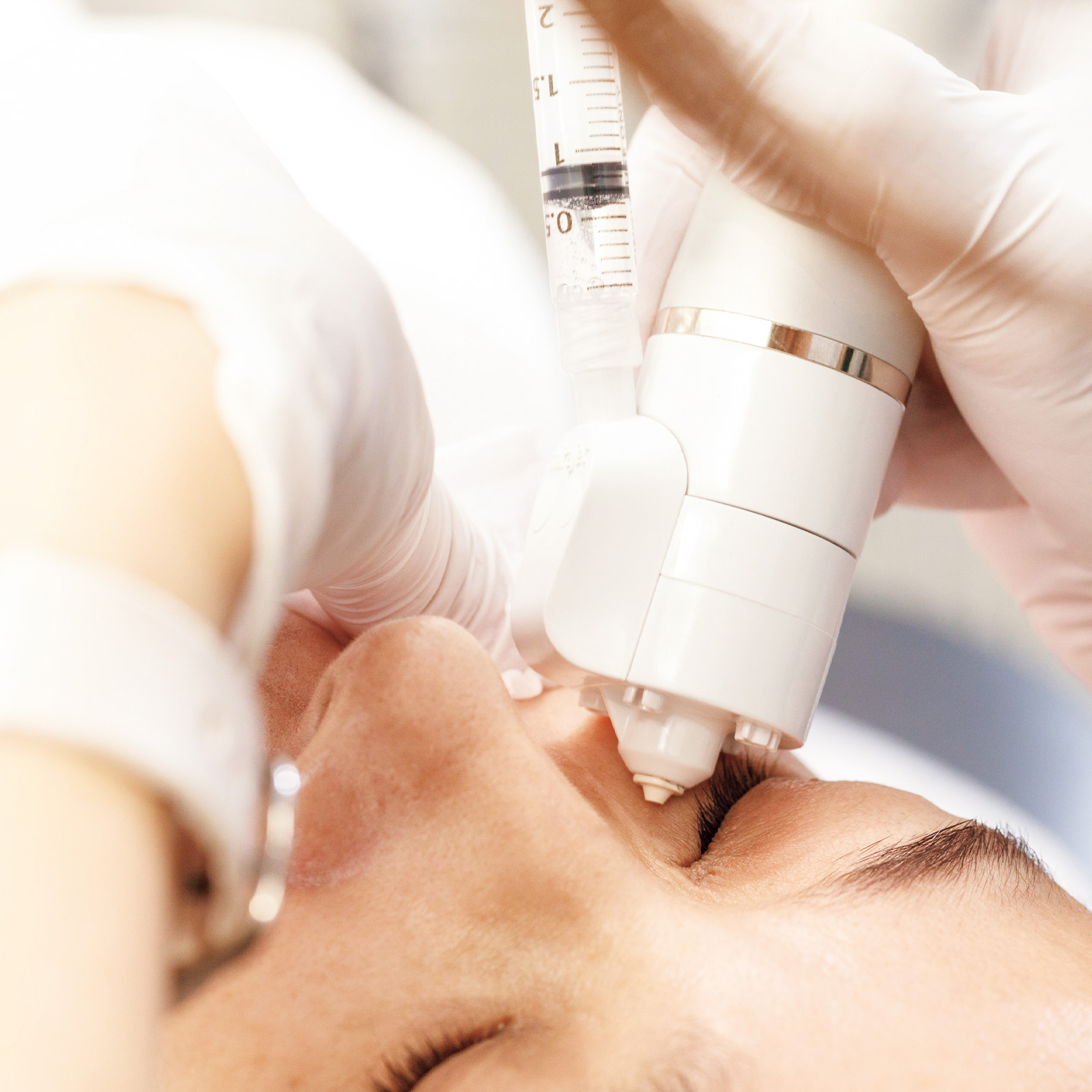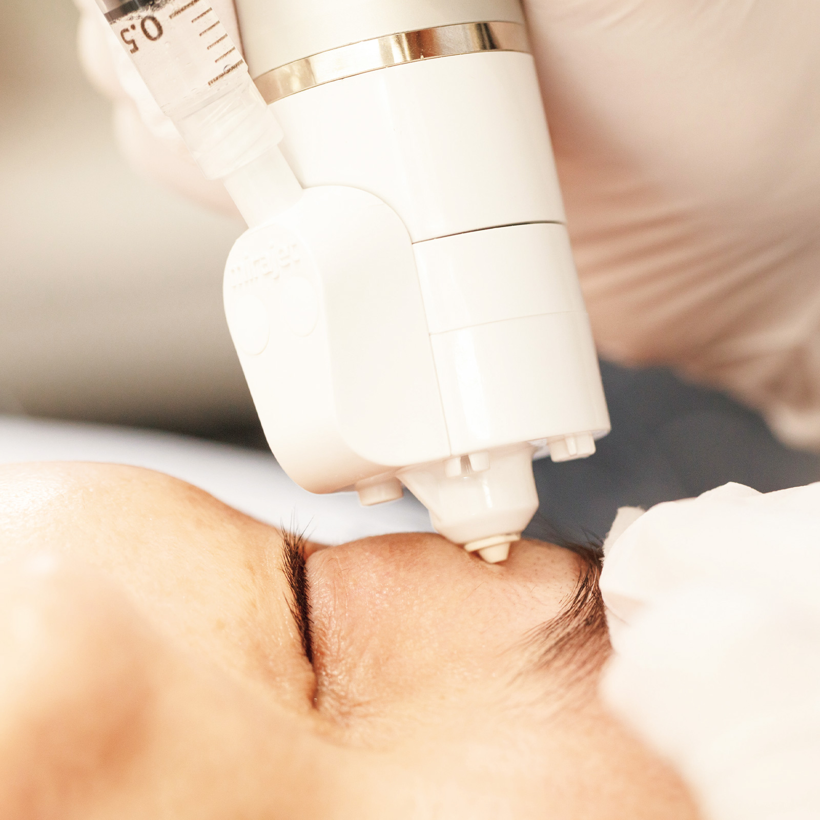 くすみ部位をしっかり診察。上瞼、下瞼ともにミラジェット Forteでダームエデンを入れ込みます。顔全体に行えば、更に全体的にトーンアップし明るく。先生自らも大好きな施術とか。ホームケア用もお勧めです。