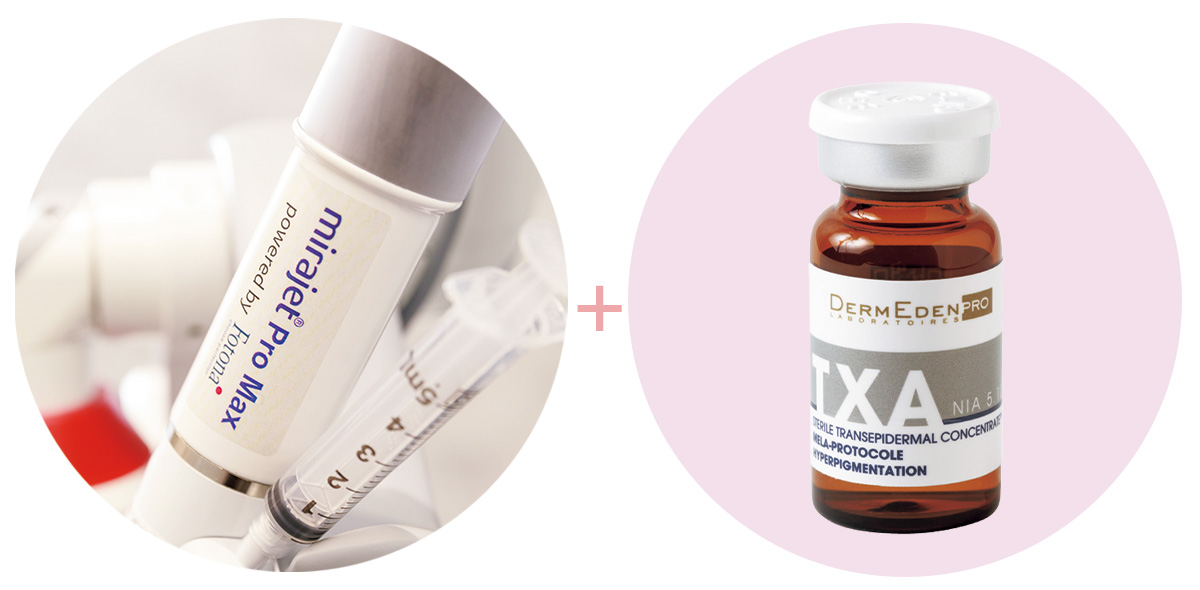 ミラジェット Forte(フォルテ)は熱作用を必要としないマイクロジェット技術を採用し、毎秒50回の噴射を実現。針を使わずレーザー照射を応用することで、噴射速度や薬剤の注入量もコントロール可能。手打ちや水光注射では薬液が入りにくい部位にも薬剤をデリバリーできます。そしてくすみにはダームエデンを。トラネキサム酸5%とナイアシンアミド10%を入れ込むことで色素沈着を改善しトーンアップ。