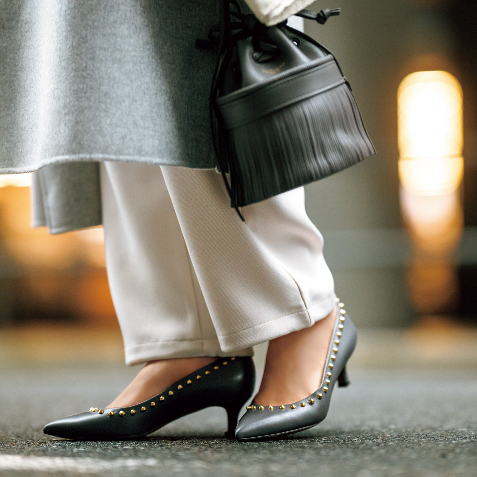 “走れるパンプス”として人気を博したANDREAが2024年に待望の復活。履き心地の良さとデザインの美しさが魅力。パンプス[H4.5㎝]¥79,200(ペリーコ/アマン)ジレ¥63,800(カデュネ)ニット¥10,450(Mila Owen/Mila Owen ルミネ新宿2店)パンツ¥6,600(オペーク ドット クリップ)バッグ¥126,500(J&M デヴィッドソン/J&M デヴィッドソン カスタマーセンター)ピアス¥3,900〈soie〉リング[人差し指]¥27,500〈Pearl for Life〉(ともにロードス)バングル¥11,550〈Hh〉リング[中指・薬指]¥19,800〈イットアトリエ〉(ともにフォーティーン ショールーム)手持ちしたストール¥16,500(マニプリ)