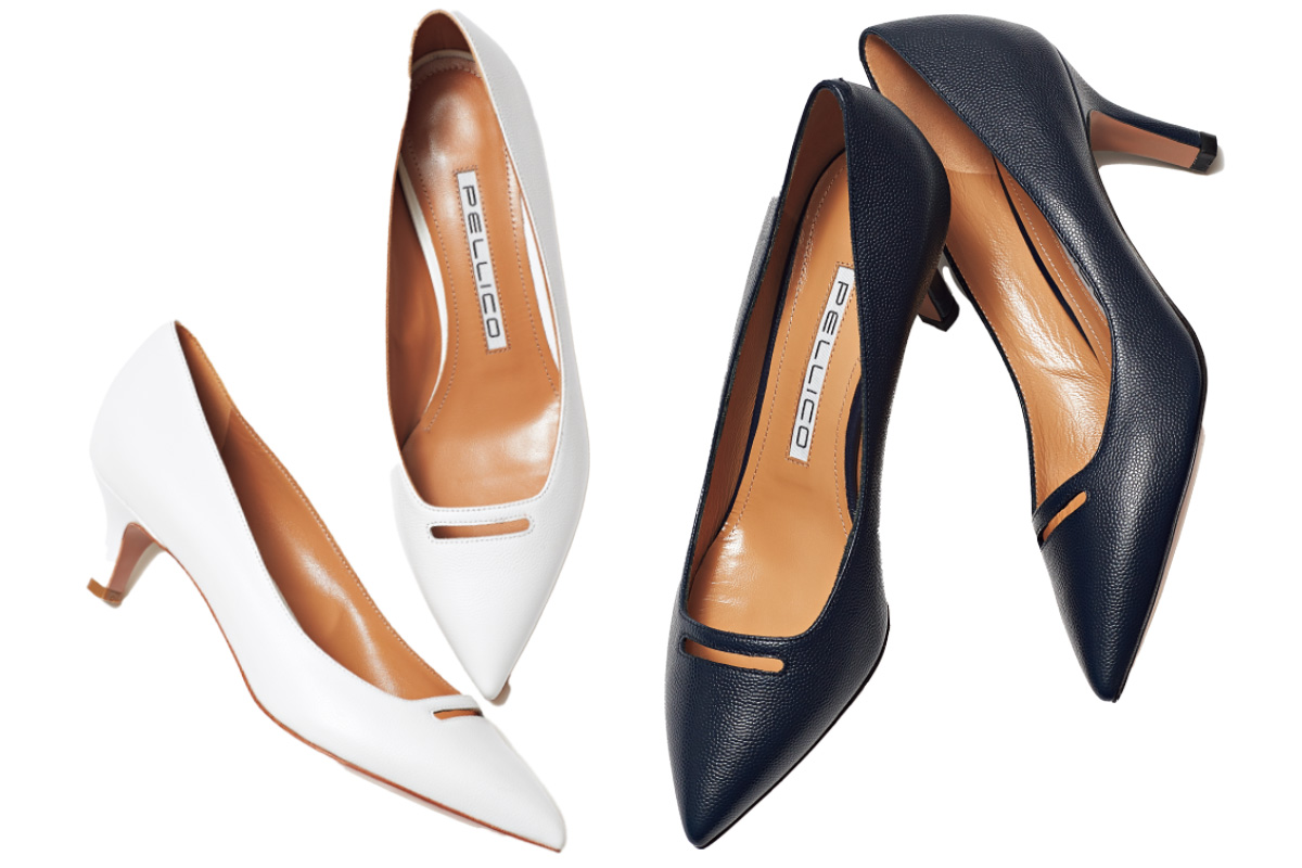 シャープなつま先のシルエットでありつつ、やや広めのワイズと立体感のあるフォルムが特徴。左から ホワイトパンプス[H4.5㎝]¥68,200 ネイビーパンプス[H7㎝]¥68,200(ともにペリーコ/アマン)