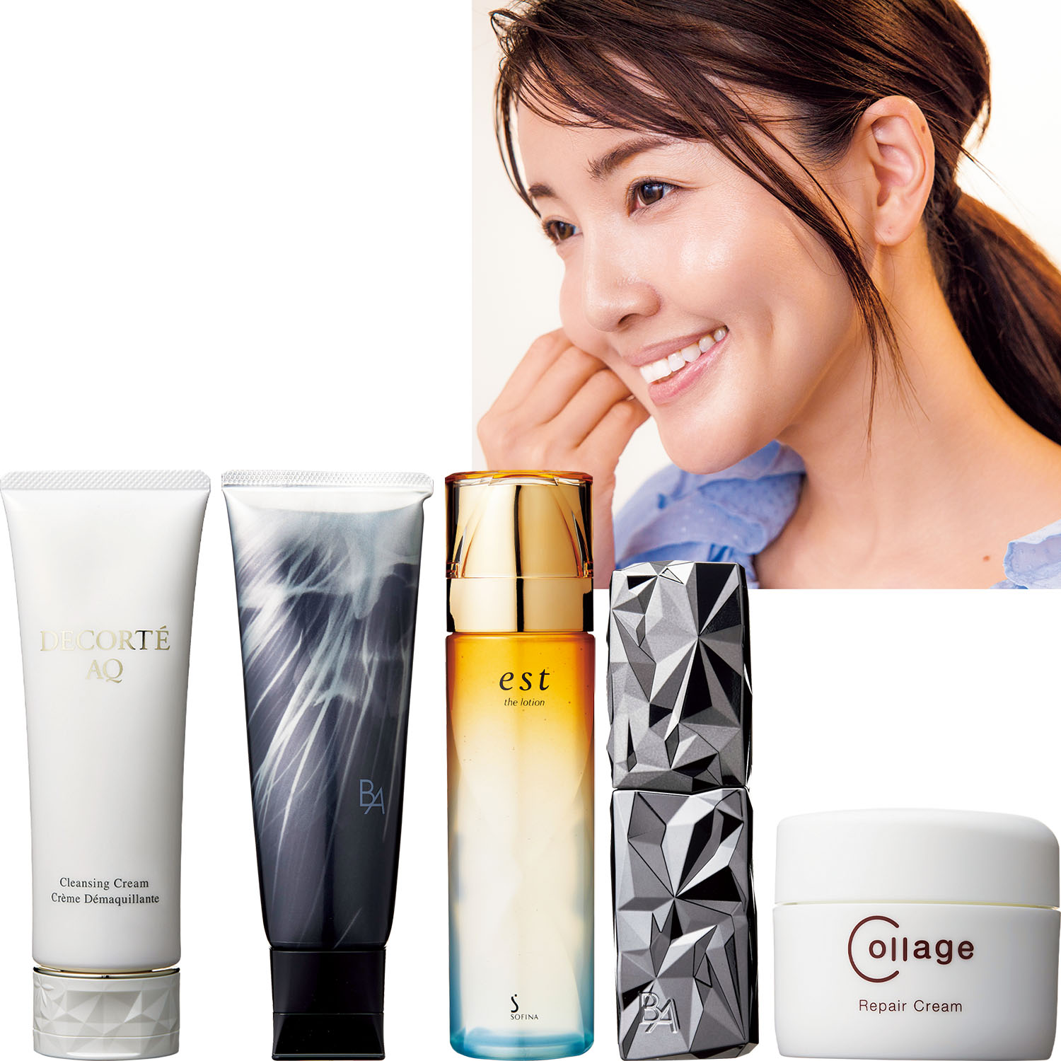 朝のスキンケアがシンプルなので、夜はしっかり時間をかけてケア。右から:コスデコのクレンジングでメイクオフしたあと、ポーラで保湿しながら洗顔、est ザ ローションで潤わせ、ポーラの美容液で肌にハリを、コラージュリペアのコックリクリームでふたをしてフィニッシュ。時間 があるとマスクや美顔器を投入し美肌をキープ。