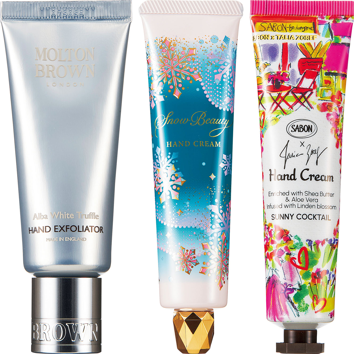 帰宅後はモルトンブラウンのハンドエクスフォリエイターで手を洗い、次にサボンかスノービューティーのハンドクリームで保湿します。必ずハンド専用のコスメを使い、肌に強すぎないものを選ぶようにしています。