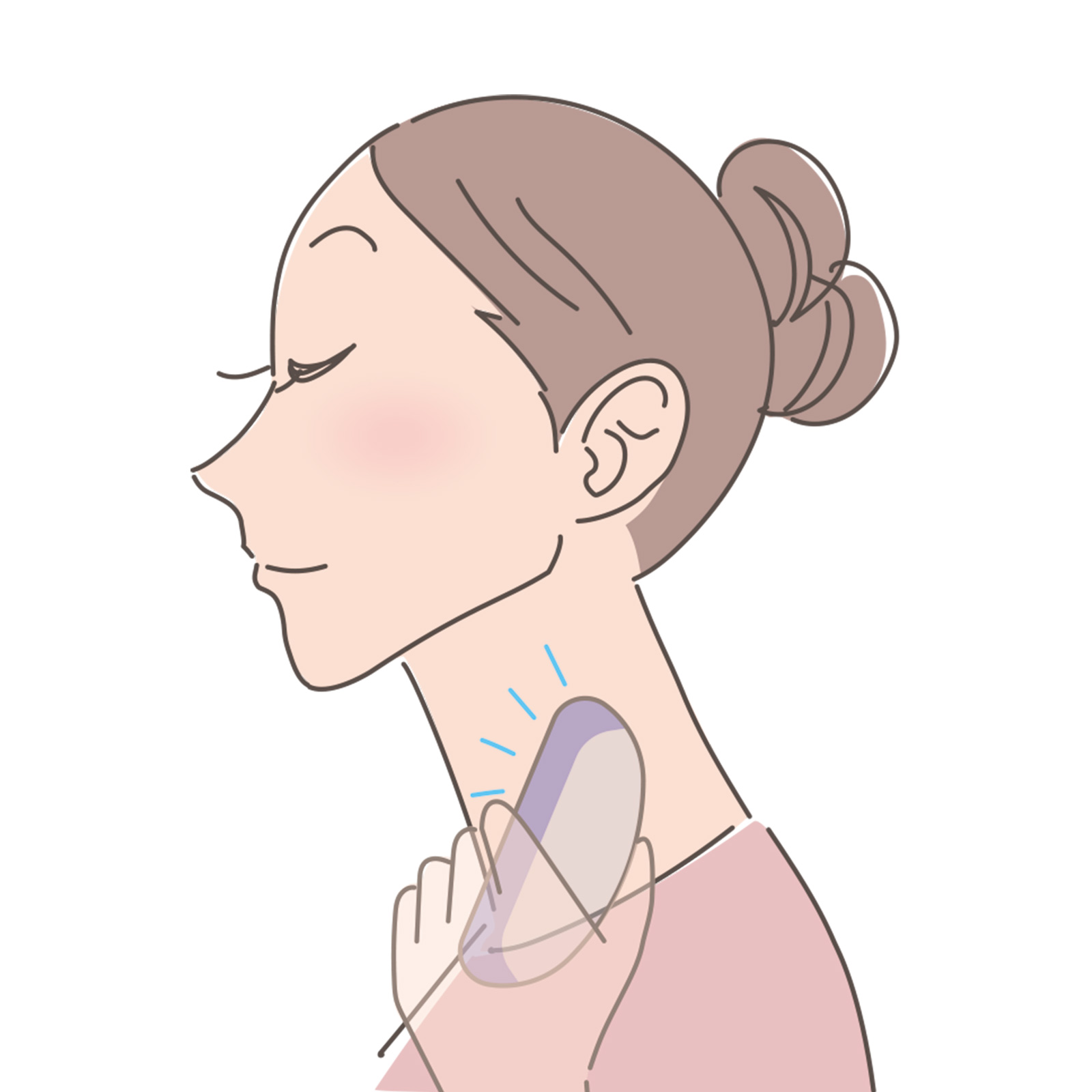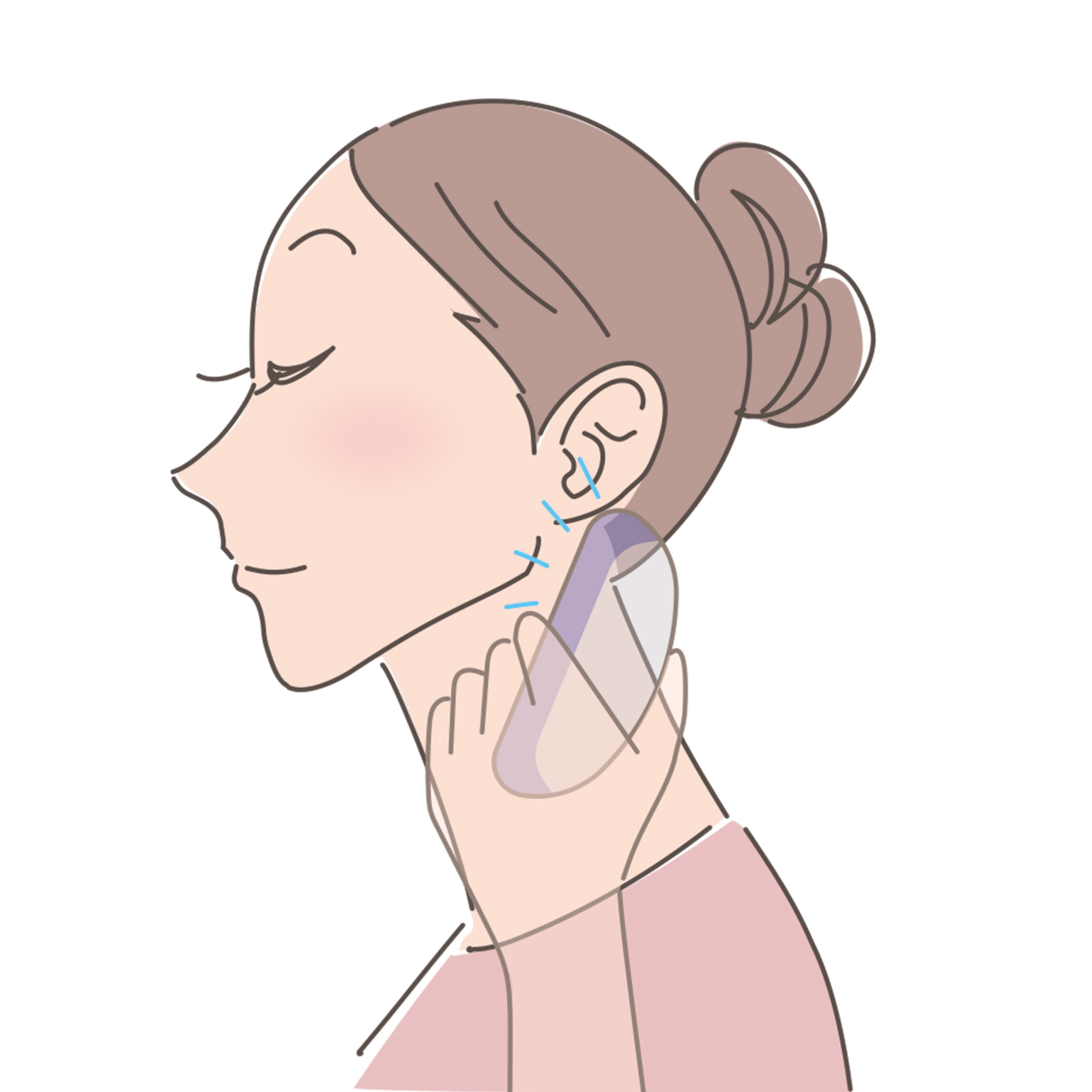 2:耳の後ろは、胸鎖乳突筋など多くの首の筋肉の起点となる部分。ここをほぐすとあご下全体に刺激が。