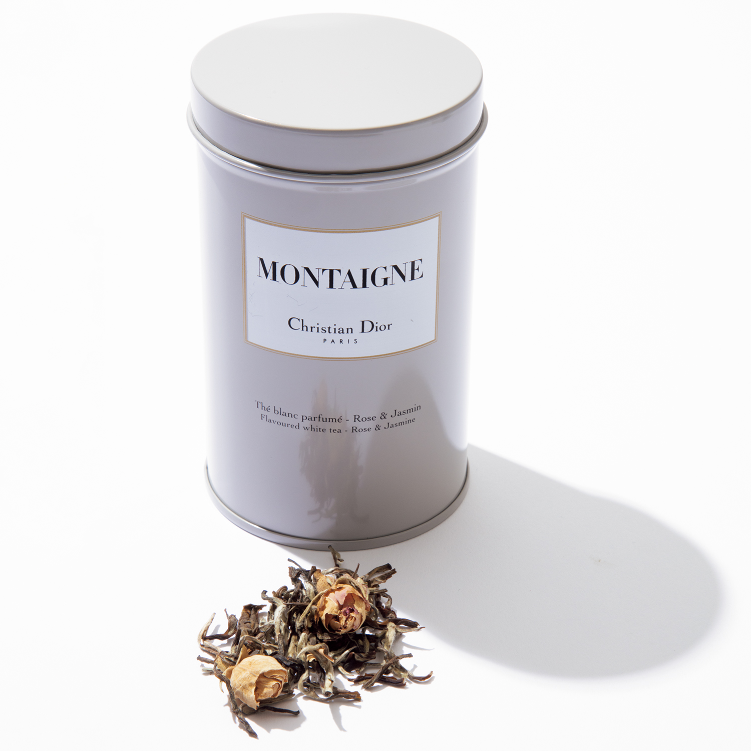 ローズ&ジャスミンのフレーバーホワイトティー。バラのつぼみが入ったエレガントな香りで優雅に癒されて。DIOR MAISON MONTAIGNE ティー キャニスター 60g ¥7,600(クリスチャン ディオール)