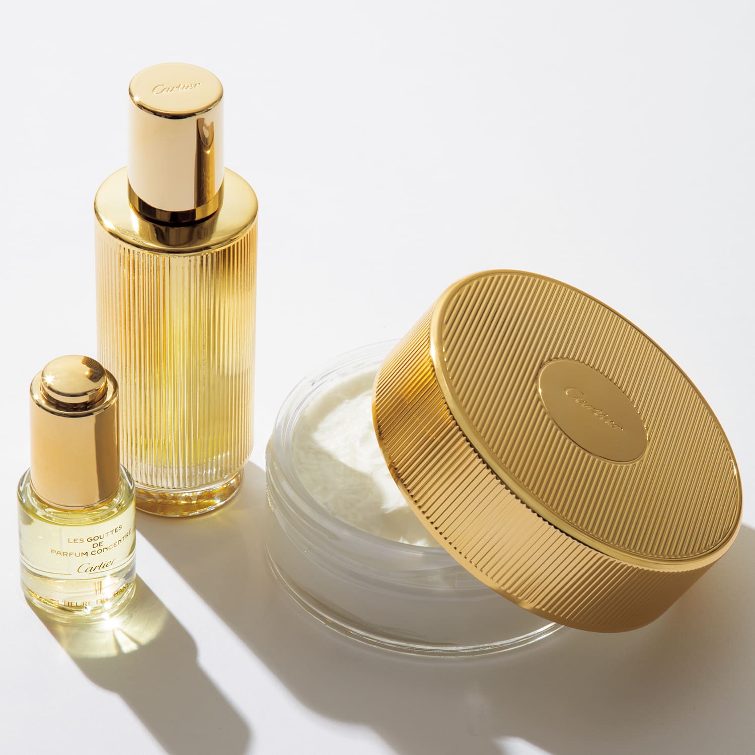 優美な香りが楽しめるボディケアシリーズはGINZA SIXでのみ発売中。輝くゴールドのパッケージも開運に。左:レ グット ドゥ パルファン コンサントレ ルール ディアファン¥18,150、中:レ バーズ ア パルフュメ ユイル ピュール ¥34,980、右:同 クレーム ピュール ¥26,235(カルティエ)