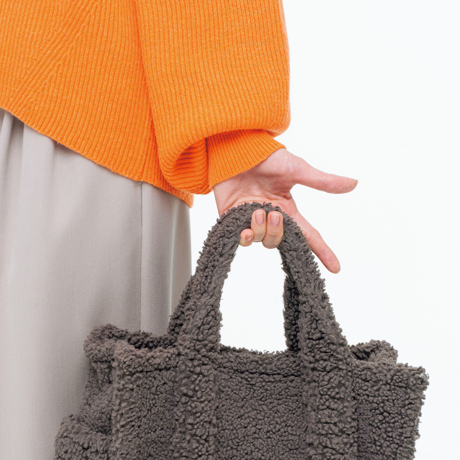 バッグを持つときも手の平を正面に。そのとき、小指を中心に薬指・中指と3本の指で持つと腕の後ろの筋肉を使えてより効果的。