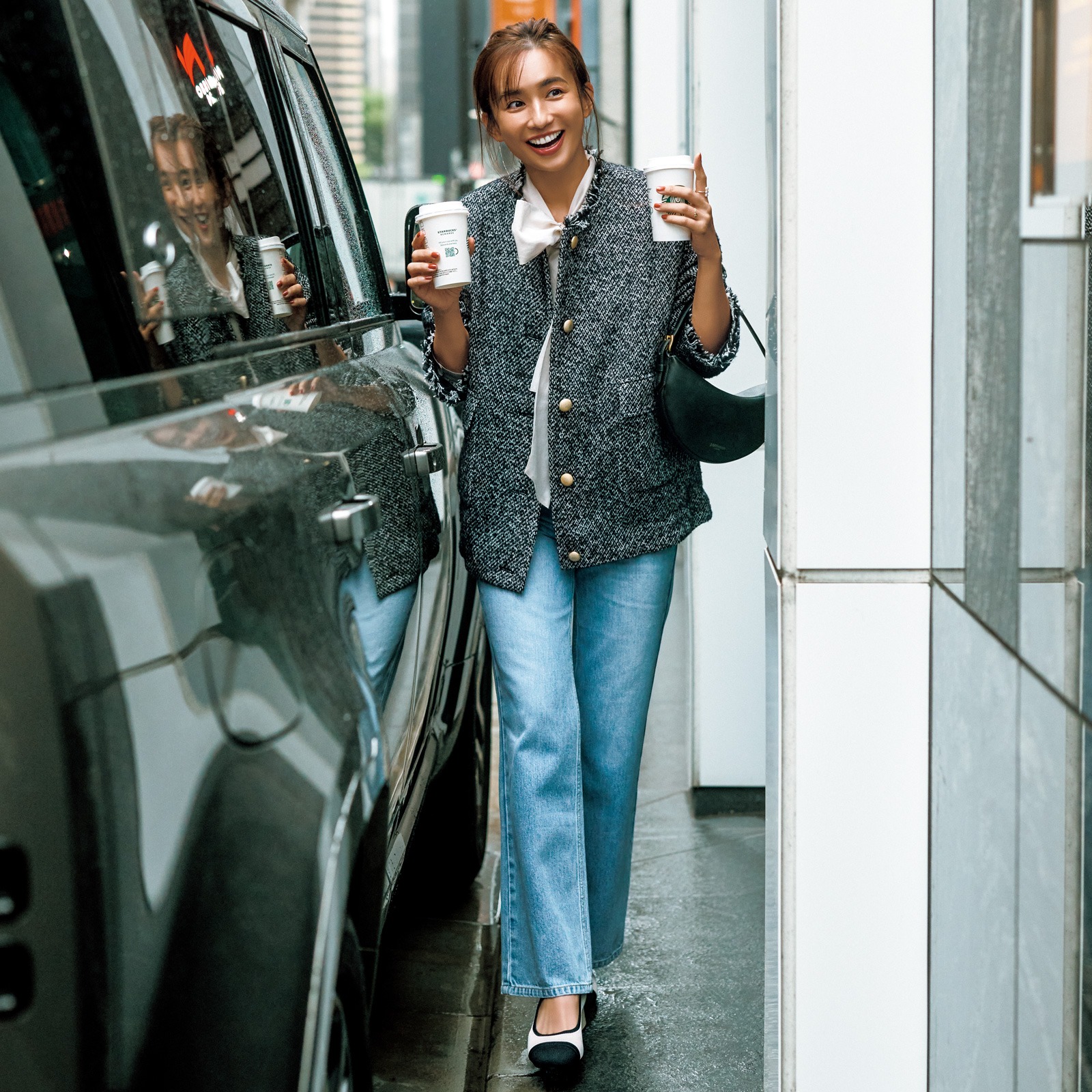 パンプス[H4.5cm]¥20,900(VIVAIA)ジャケット¥52,800(エリオポール/エリオポール代官山)ブラウス¥20,900(ドレステリア/ドレステリア 渋谷スクランブルスクエア店)デニムパンツ¥9,900(Mila Owen/Mila Owen ルミネ新宿2店)バッグ¥99,000(J&M デヴィッドソン/J&M デヴィッドソン カスタマーセンター)ピアス¥86,900リング[薬指]¥165,000(ともにマリハ)リング[人差し指]¥46,200(Pearl for Life/ロードス)