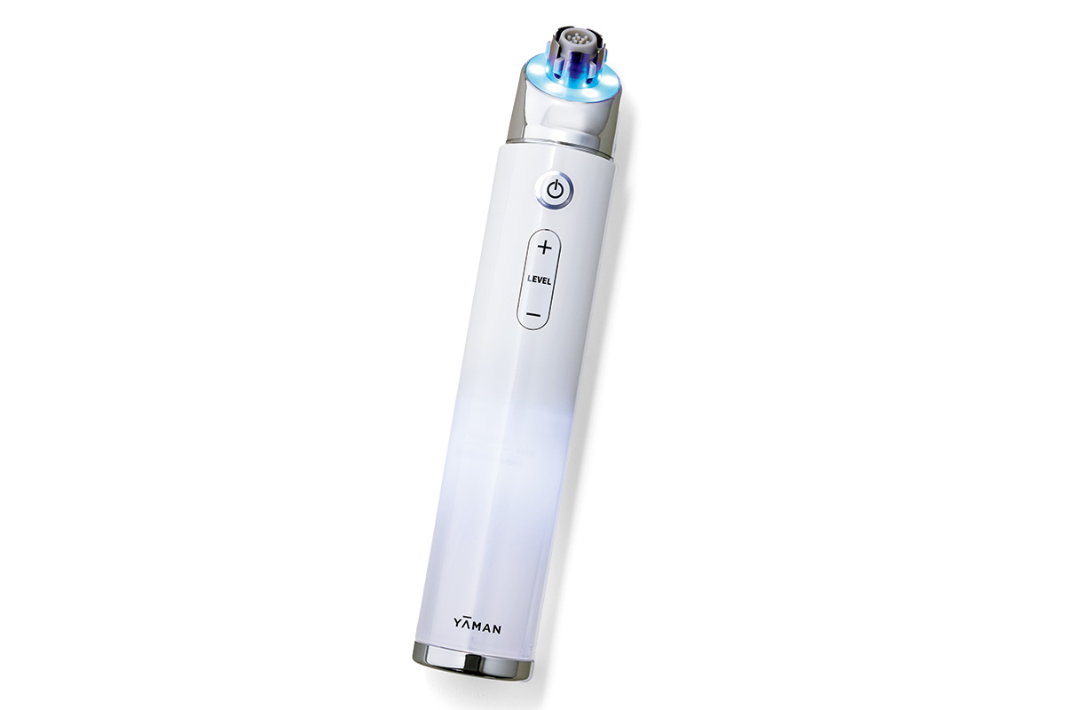 クレンジングや洗顔では落としきれない汚れを一掃する、家庭用の超音波ピーリング機器。ハイドラブライトスキン ¥42,570(ヤーマン)