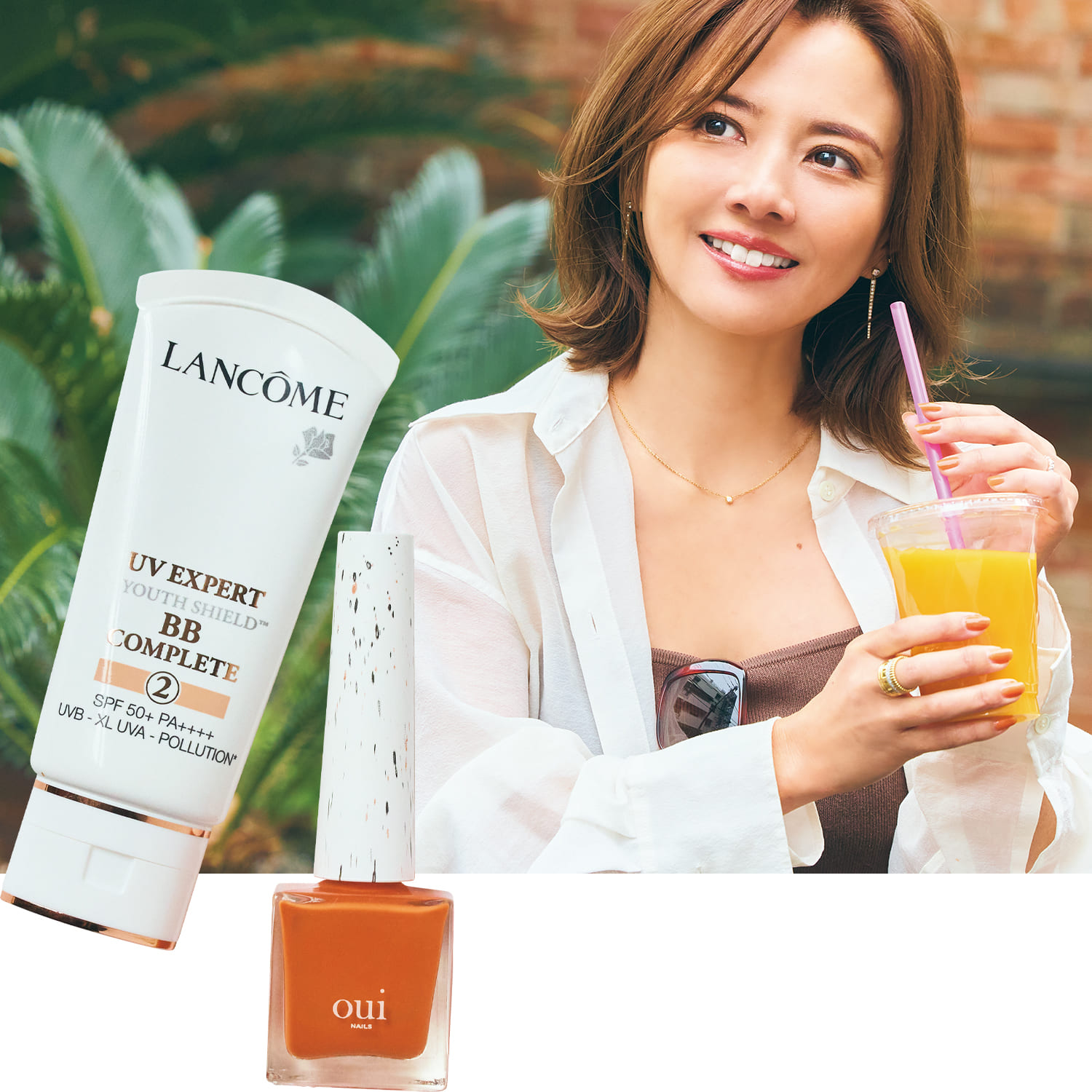 「暑いビーチで娘たちと遊んでいれば、メイクは崩れるのが当たり前。崩れてもドロドロにならないようにUVカット効果の高いランコムのBBクリームのみで仕上げ、色つきリップを塗れば終了!顔の色味が弱い分、ネイルを派手にしてバランスをとるのがこだわり。マニキュアのように塗れて、はがしてオフできるoui nailsがお気に入り」
