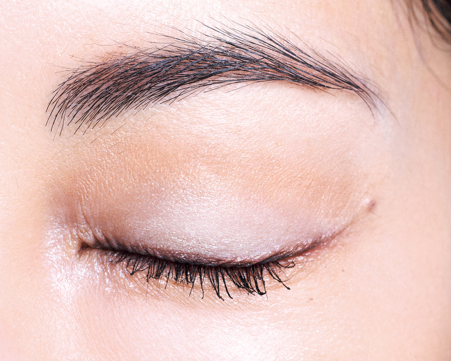 アイホール全体にDの右上(パールベージュ)と 右下(明るめブラウン)を混ぜて塗り、ぼかす。二重部分にAの左上(ホワイト)をのせ、目頭にもオン。手持ちのブラウンアイライナーで目のキワを締めたら、上からDの左下(カーキ系)を重ねてぼかし、よりナチュラルな印象に。