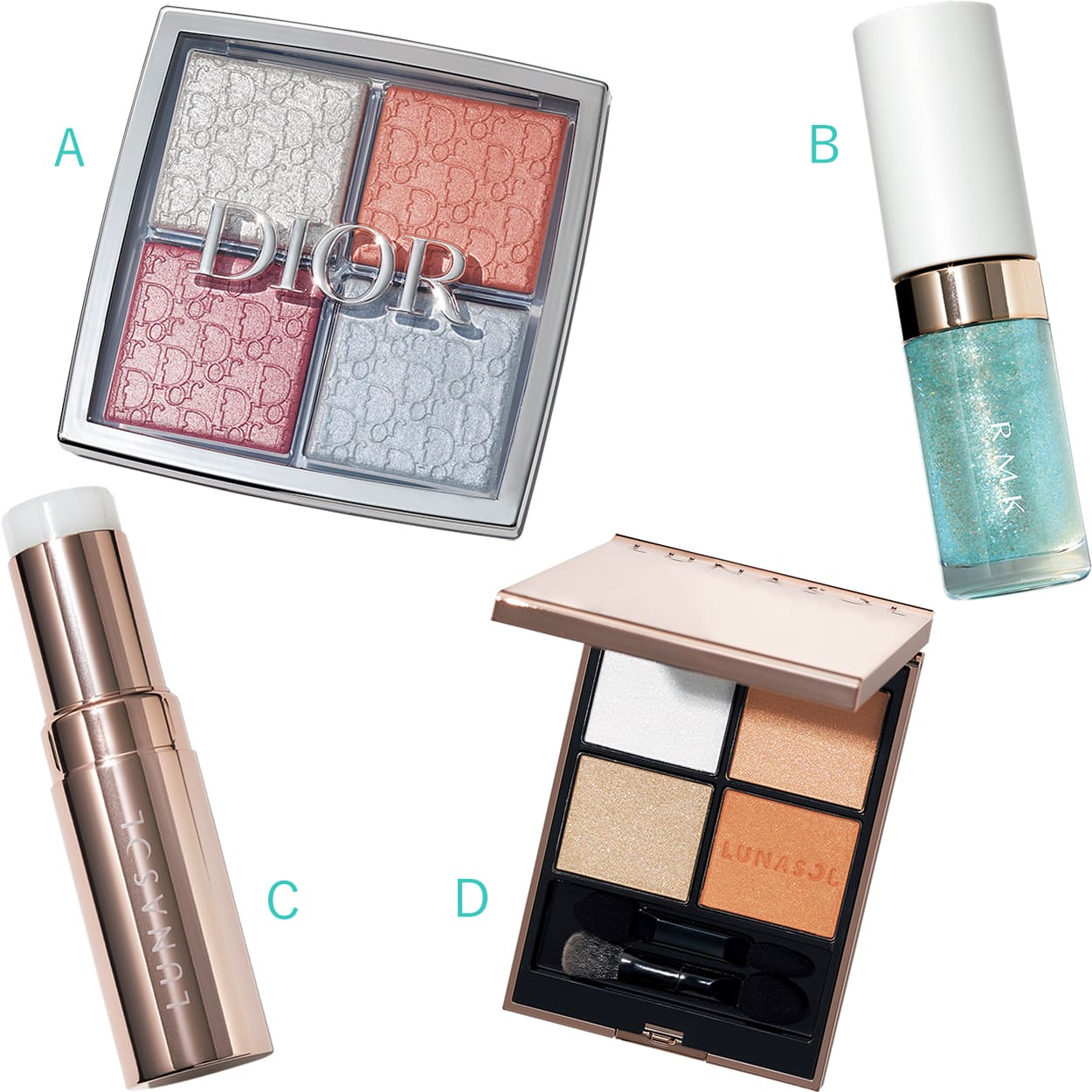 A:繊細な煌めきと透明感をプラスするパールホワイト、コーラル、ローズ、アイスブルーがセットされたマルチパレット。ディオール バックステージ フェイス グロウ パレット 006 ¥6,600 ※数量限定品(パルファン・クリスチャン・ディオール)B:グリーンやイエローのパールが角度によって表情を変えるグロス。手持ちのリップに重ねても◎。RMK リップ ルミナイザー 06 ¥3,520(RMK Division)C:頰やまぶた、唇にみずみずしいツヤを与えるクリアなスティックハイライト。ルナソル ラディアントスティックN 01 ¥4,950 ※1/24発売(カネボウ化粧品)D:光に包まれたベージュとアイスブルーが目元の透明感を際立たせる。ルナソル アイカラーレーションN 04 ¥7,700 ※1/24発売(カネボウ化粧品)