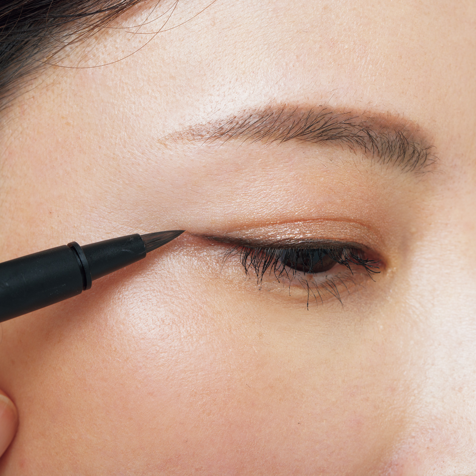 自分の目のフレーム通りに極細のラインを引きます。目尻は跳ね上げず、延長線上にスッと伸ばすと自然な陰影に。上まぶたのみに。