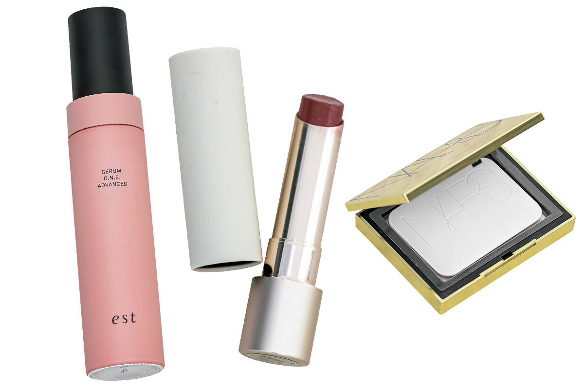エスト セラム ワン アドバンスドの炭酸による美容液が、シワ・シミ・潤いに効果抜群です。RMKデューイーメルト リップカラー03は何にでも合う粘膜カラーでお気に入り。顔のくすみはNARSライトリフレクティングセッティングパウダー プレスト Nでカバーしています。