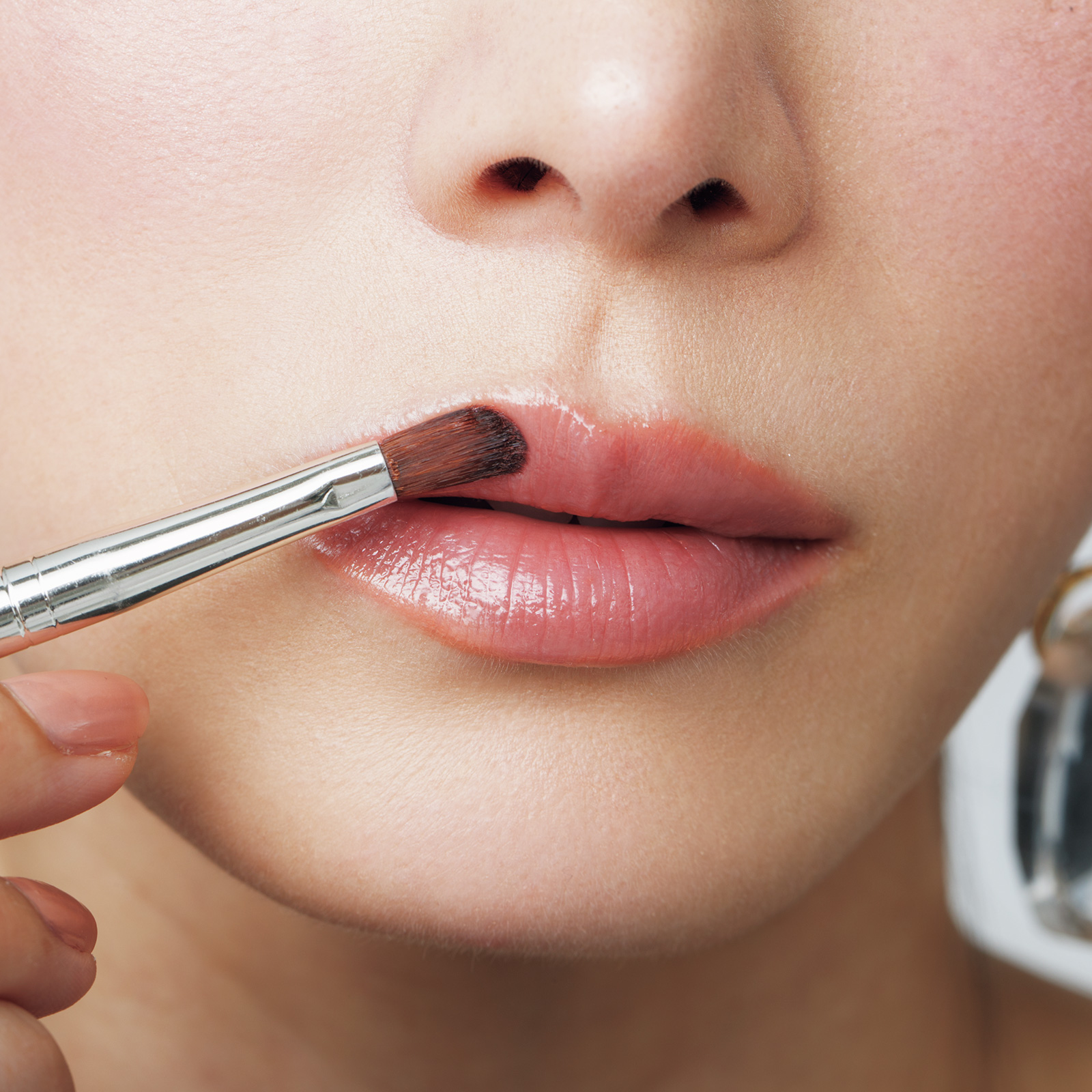 透明感ある柔らかい発色のリップ。大人は丁寧にブラシで塗るのが正解。アウトラインを整えるように塗布。少しオーバーに塗って。
