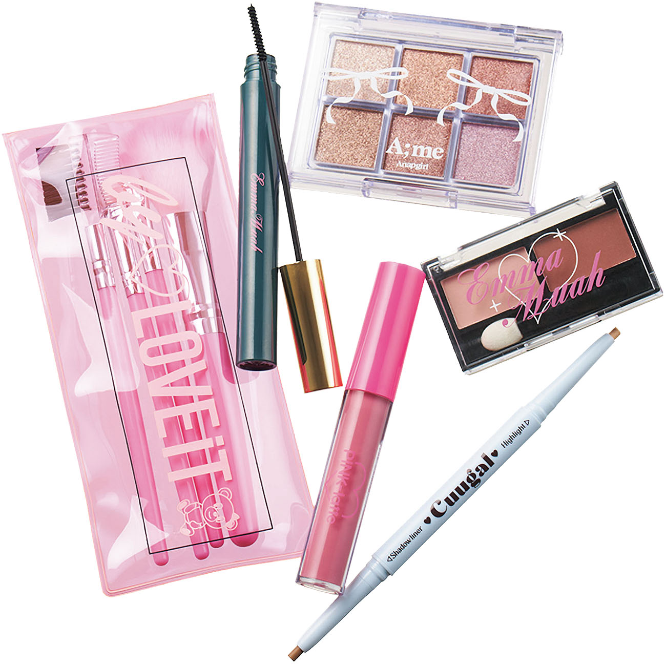 読者の欲しい!を形にするオリジ ナル付録。キラキラシャドウ、塗るだけで束感まつ毛が作れるマスカラ、ブラシセット、ちゅるんと可愛いピンクグロス、涙袋ライナーまで♡