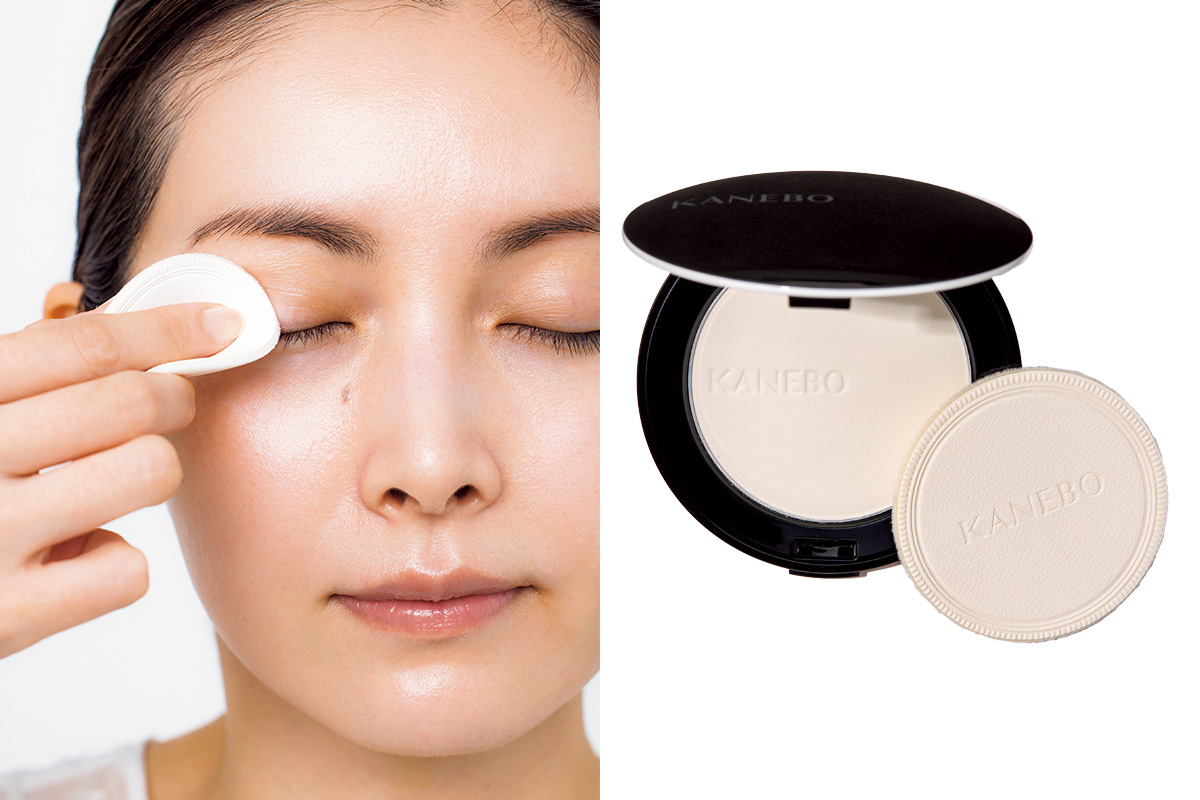 べたつきや皮脂浮きをオフするために小鼻、髪の生え際やフェイスラインにお粉を。ヨレやすい二重幅や目のキワは、パフを半分に折ってのせて。