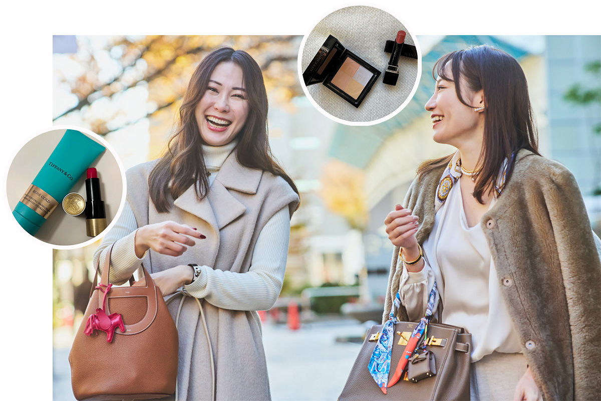 森津さん(左)はティファニー ローズゴールド ハンドクリームとエルメスリップスティックサティネ82。伊藤さん(右)はKANEBO ルージュスターヴァイブラントV11 とジバンシイプリズム・リーブル・プレストパウダー02。