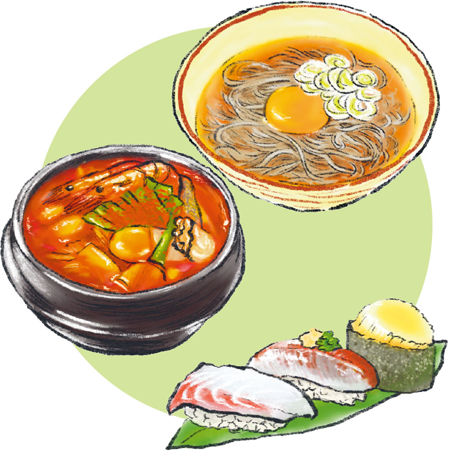 <そば・海鮮チゲ・鮨>