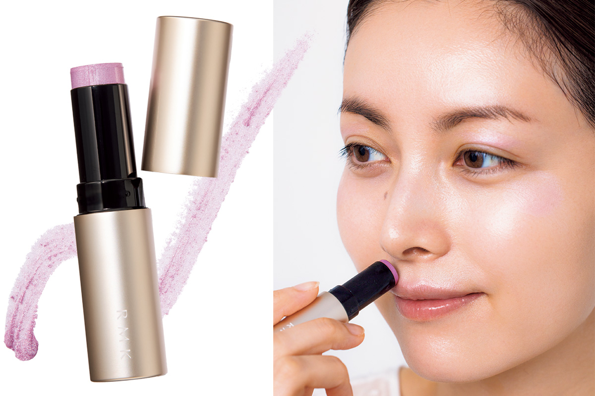 チークやハイライト、目元にも使えるマルチスティック。透明感あふれる陶器肌へと導くライラック。RMK ラディアントカラースティック 04 ¥3,630(RMK Division)