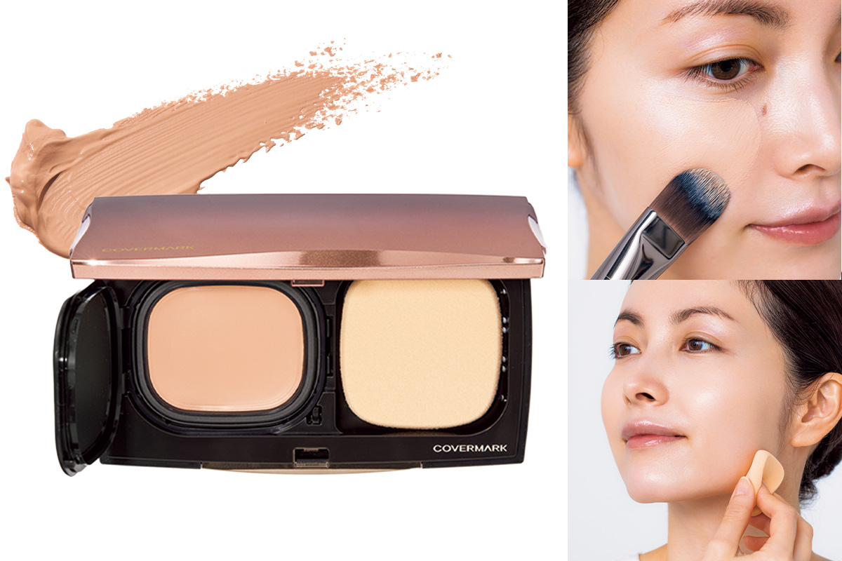 ひと塗りでシミをカバーし、大人の理想の肌へ。さらにメイクしたての美しさを一日中キープします。フローレス フィットFR20 ¥7,700(カバーマーク)※ブラシは平たく丸みを帯びたミディアムサイズ。あらゆるファンデーションを均一に塗れます。ファンデーションブラシミディアム 106 ¥6,050(メイクアップフォーエバー)