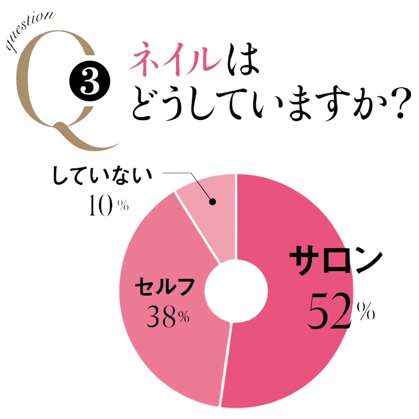 ネイルはサロンで必ずケアしているという人が約半数に。2週間に1回はケアしに行くのが鉄則です。それ以外は好きなネイルラッカーを購入して、自分で好みのネイルに仕上げている人。こまめに塗り直しして楽しんでいます。子育て中や仕事の関係でネイルをしていない人は、休日などにたまにセルフネイルを楽しんでいるそう。
