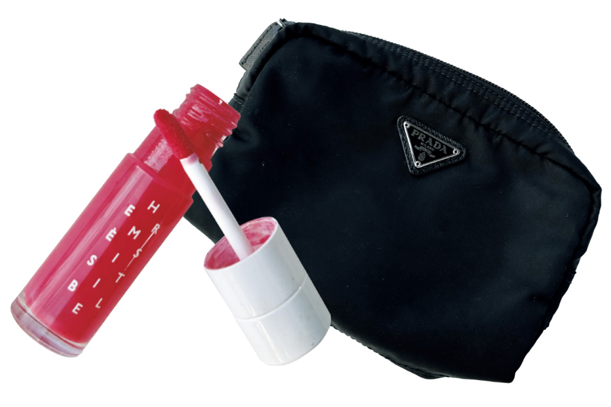 「ポーチは友人からのプレゼント。ぷっくり色っぽ唇にしてくれるリップは好きすぎて4本目です♡」(ともに私物)