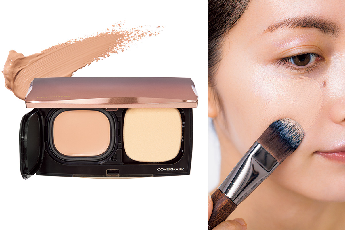 ひと塗りでシミをカバーし、大人の理想の肌へ。さらにメイクしたての美しさを一日中キープします。フローレス フィットFR20 ¥7,700(カバーマーク)※ブラシは平たく丸みを帯びたミディアムサイズ。あらゆるファンデーションを均一に塗れます。ファンデーションブラシミディアム 106 ¥6,050(メイクアップフォーエバー)