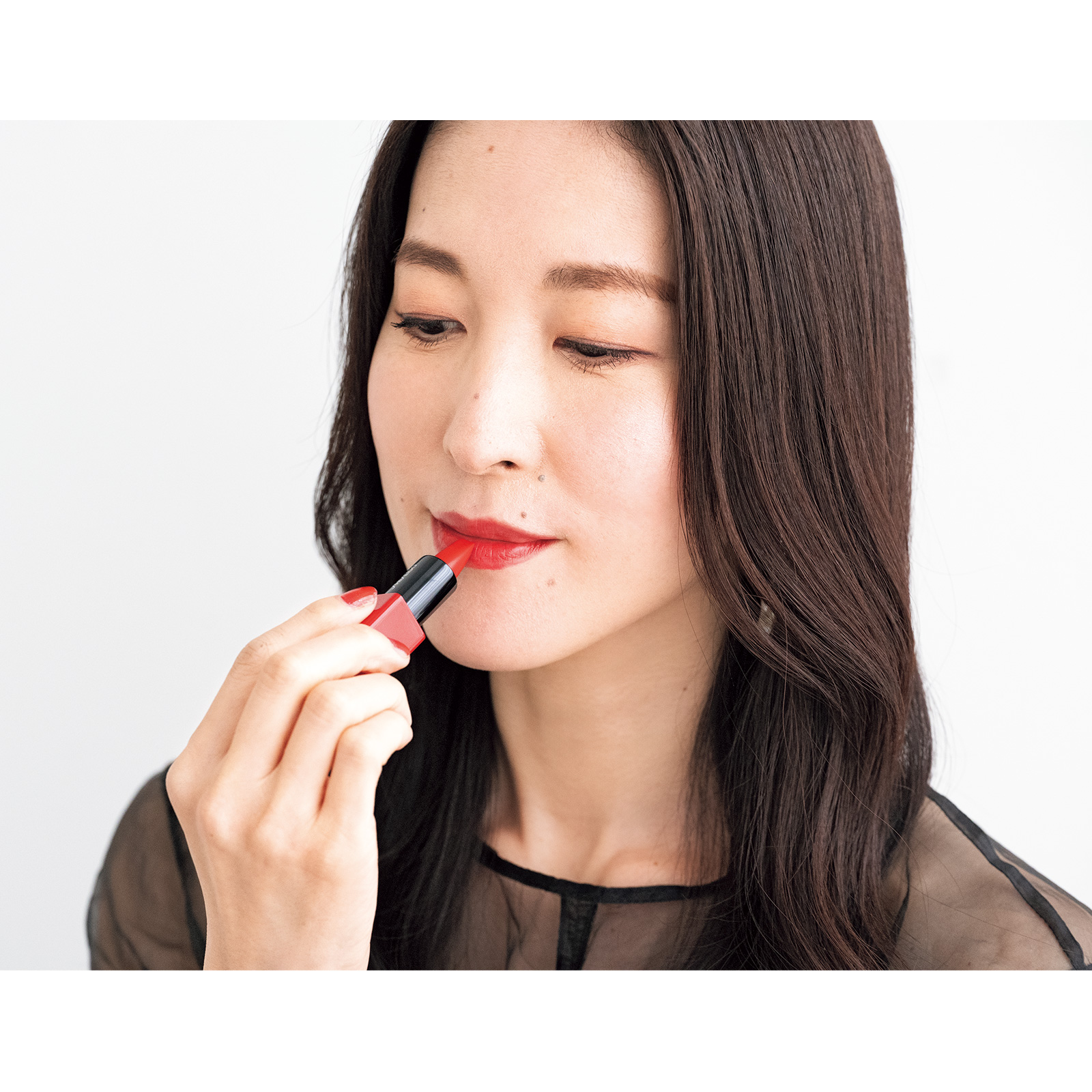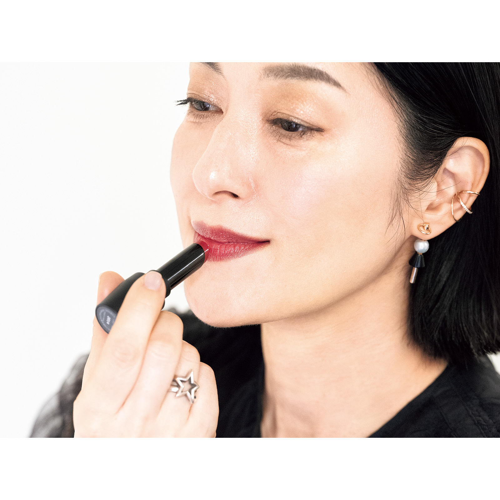 イベント前は肌もしっかり整えたいので、いつも以上にスキンケアに力を入れます。ベースメイクは艶肌仕上げ、ブランドカラーの赤リップをつけると背筋が伸びてスイッチが入ります。