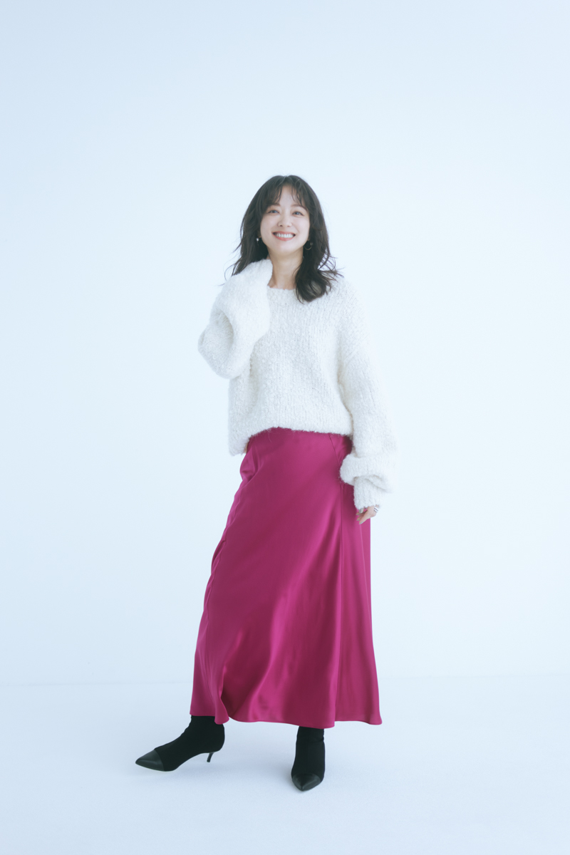 ニット¥23,000スカート¥40,000(ともにバナナ・リパブリック)靴¥41,800(ツル バイ マリコ オイカワ)ピアス¥3,240リング¥11,000(ともにアビステ)