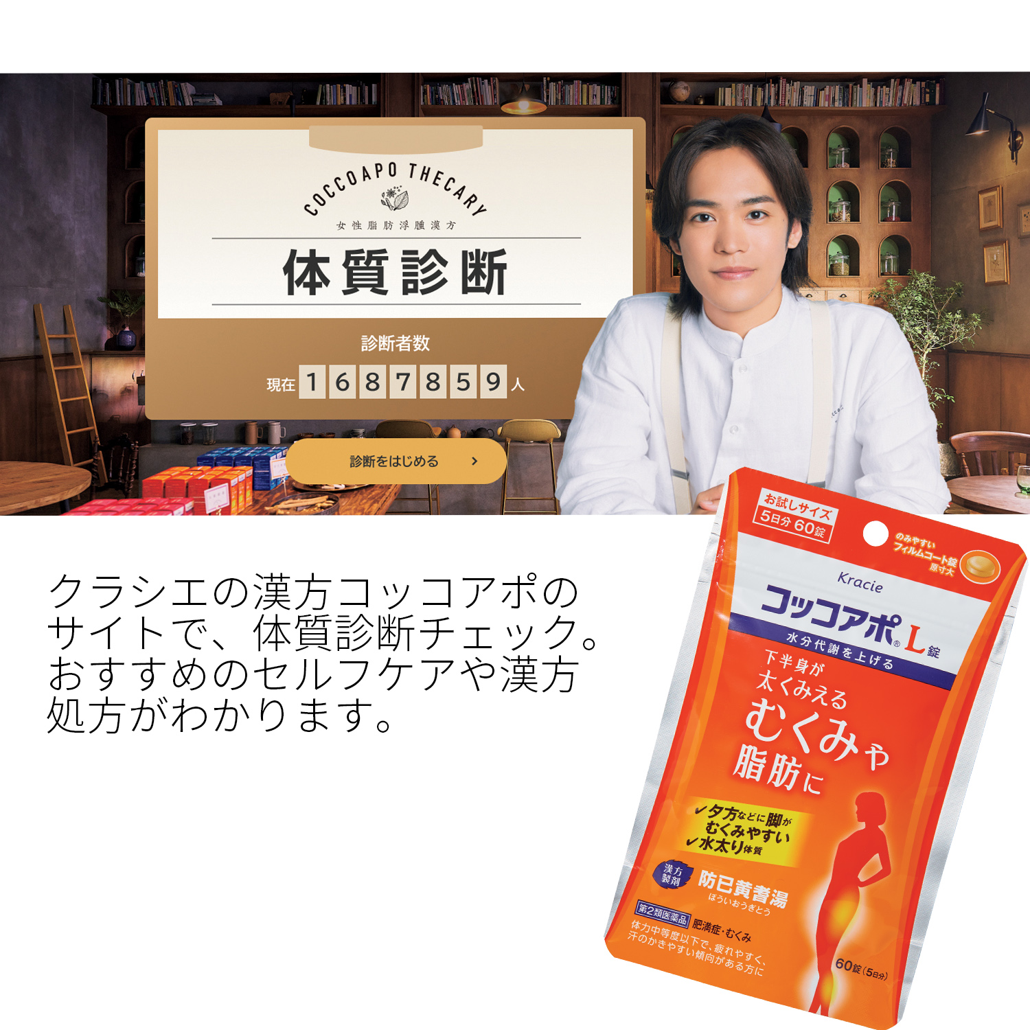 コッコアポのサイトの体質診断チェックで下半身がむくみやすいタイプと判明。防己黄耆湯の漢方薬で水分代謝を上げ、むくみや水太りを解消。コッコアポL錠[第2類医薬品]60錠¥1,100(クラシエ薬品お客様窓口)
