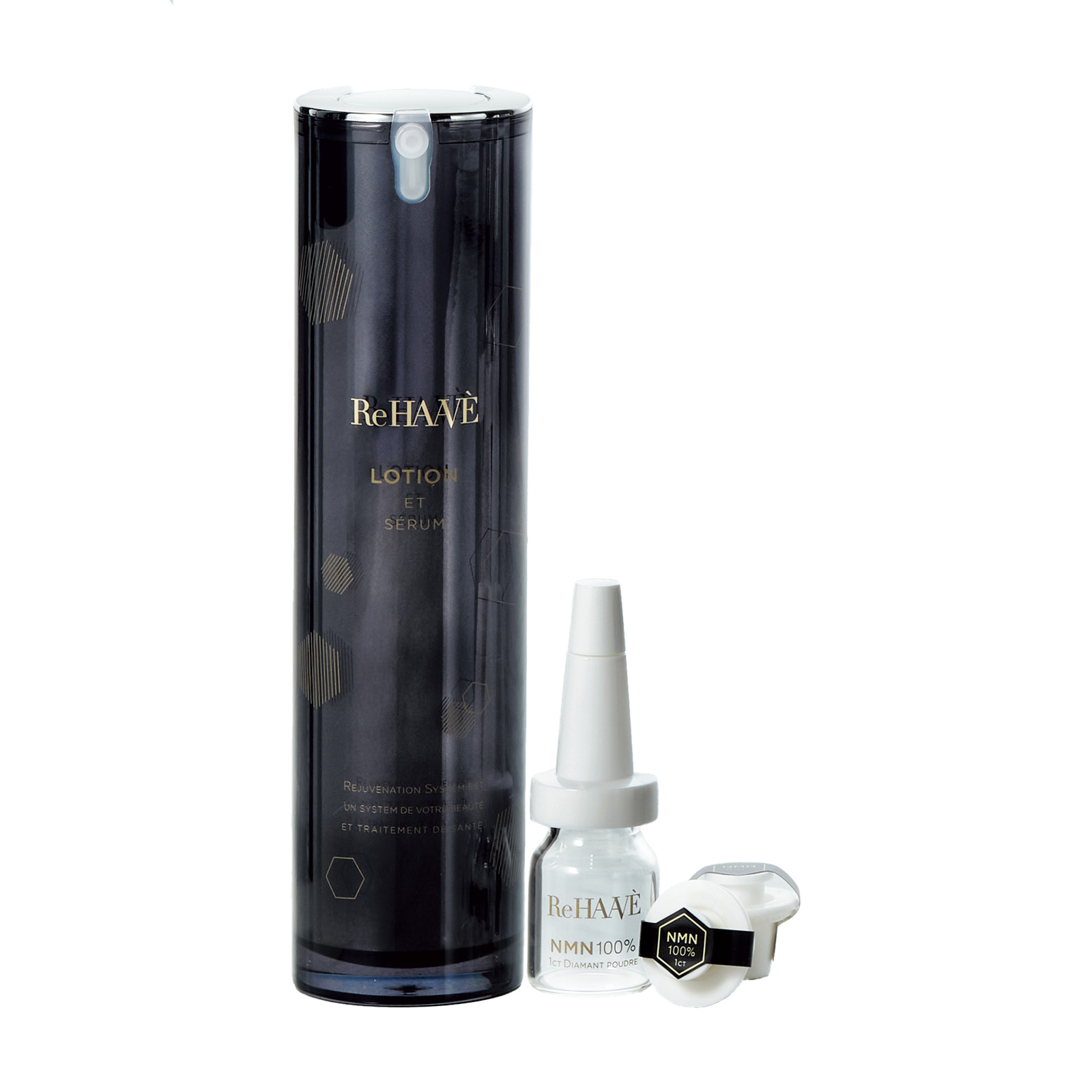 おなじみのエイジングケアサプリ「ミラグロAG」のブランド。高品質・高純度・高鮮度を追求したスキンケア「リハーヴェ」は、最先端の美容成分をいち早く搭載。左:リハーヴェ ローション エ セラム[医薬部外品]58ml ¥13,200、右:リハーヴェ NMN 100% 1ct ダイヤモンドパウダー 30個 ¥26,400