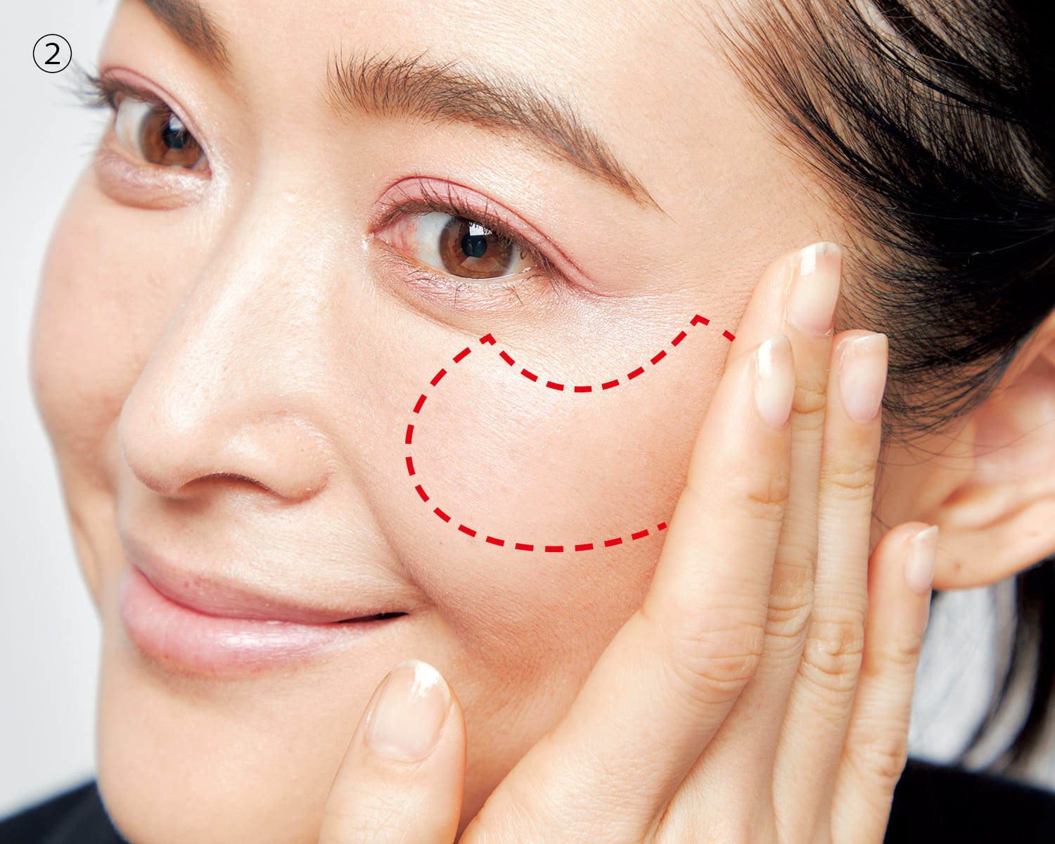 2本の指で、黒目の下からこめかみにかけて軽く叩きのばす。ふんわり広げ、中顔面短縮も。