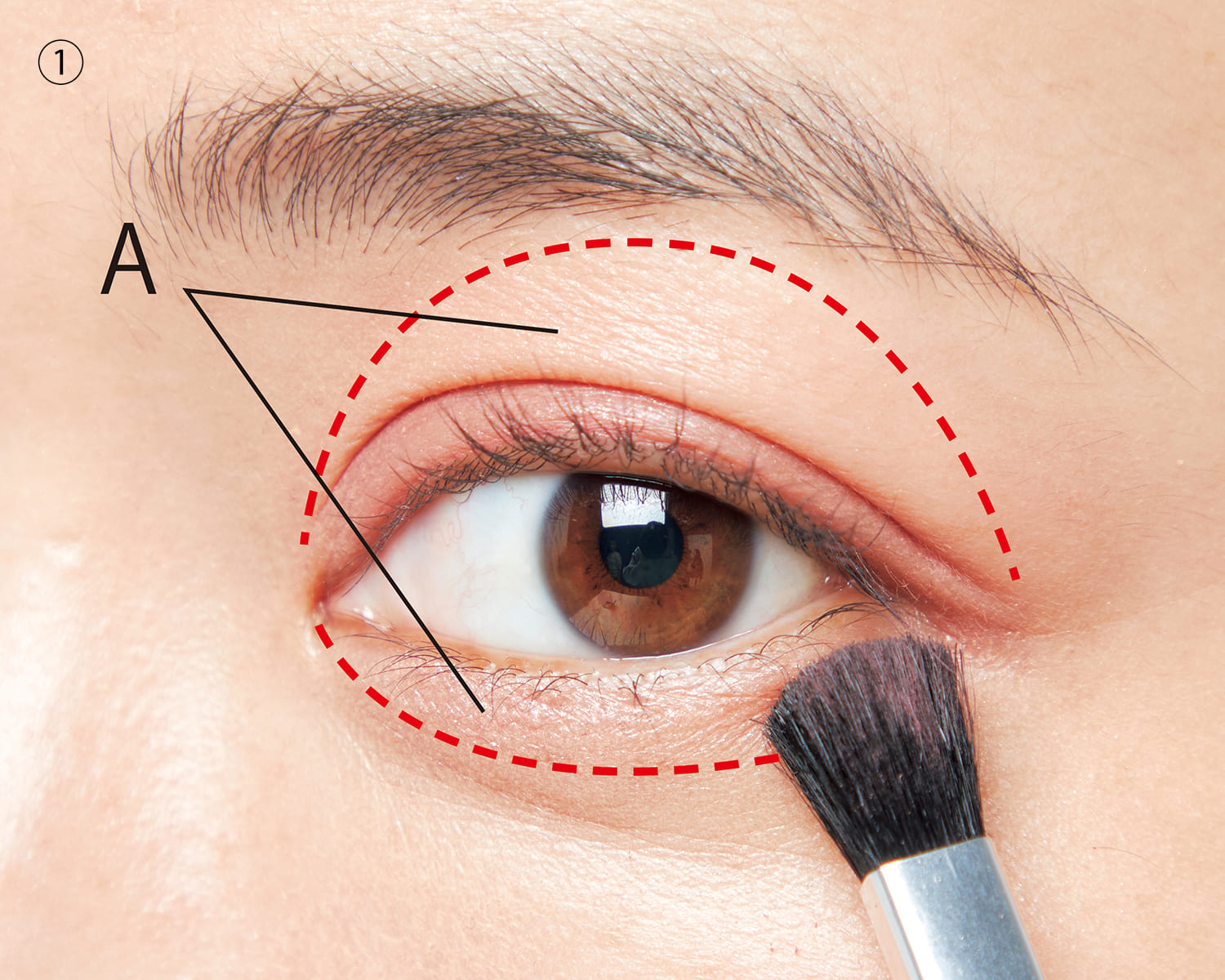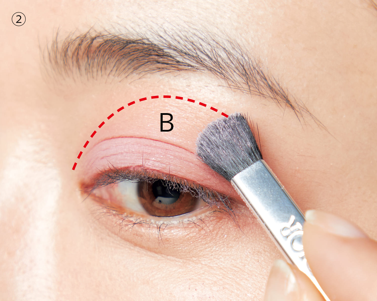Bをブラシに取り、上まつ毛のキワから入れて左右にボカし、アイホール全体に広げる。