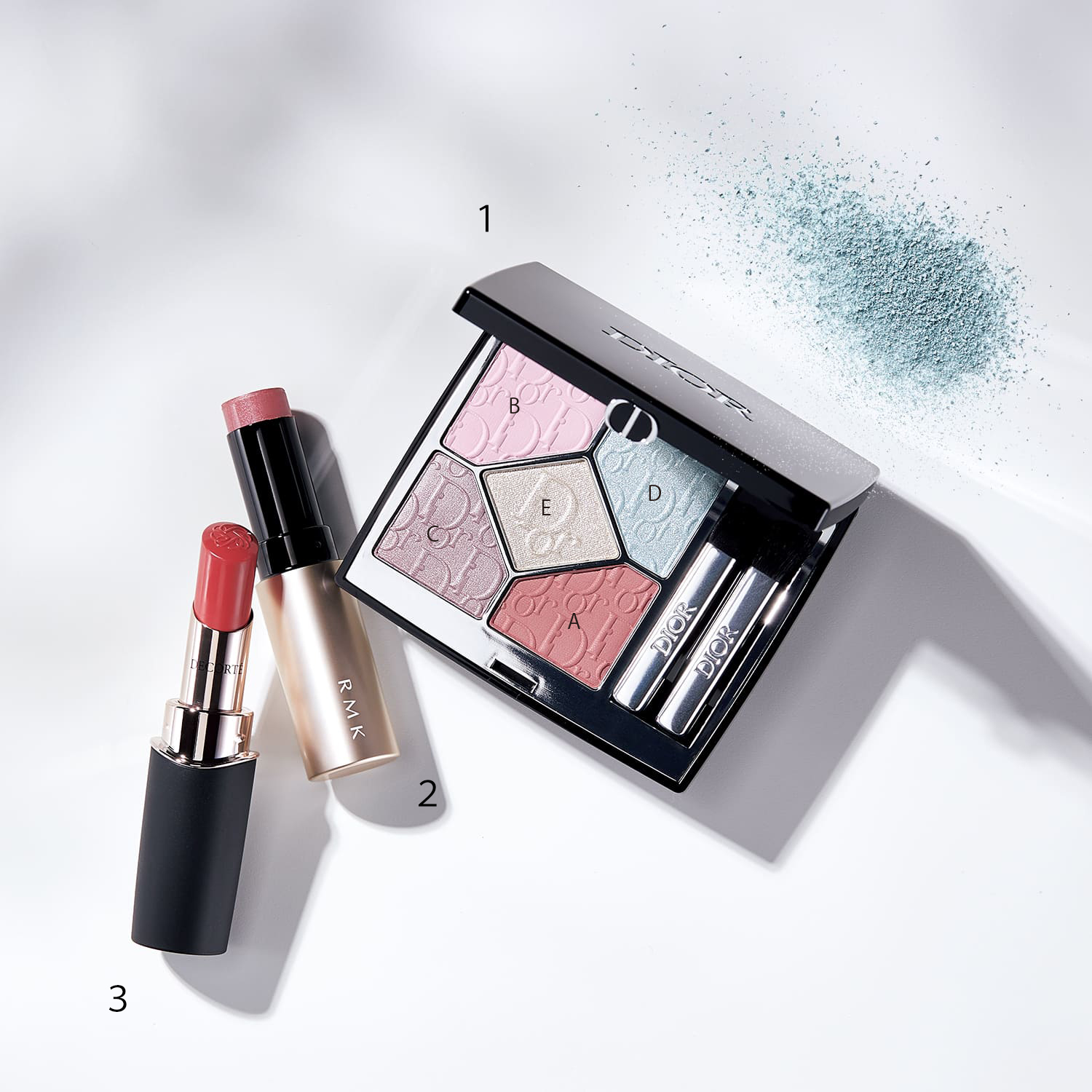 ライラック、コーラル、ベビーピンクにパステルブルーのアクセント。グリッター、マット、サテン、ベルベットの質感の違いで濃くないのに奥行きが出る。見たままの淡色でまぶたを染めて、光とハリ感をプラス。ディオールショウ サンク クルール 812 ¥10,010※数量限定(パルファン・クリスチャン・ディオール)