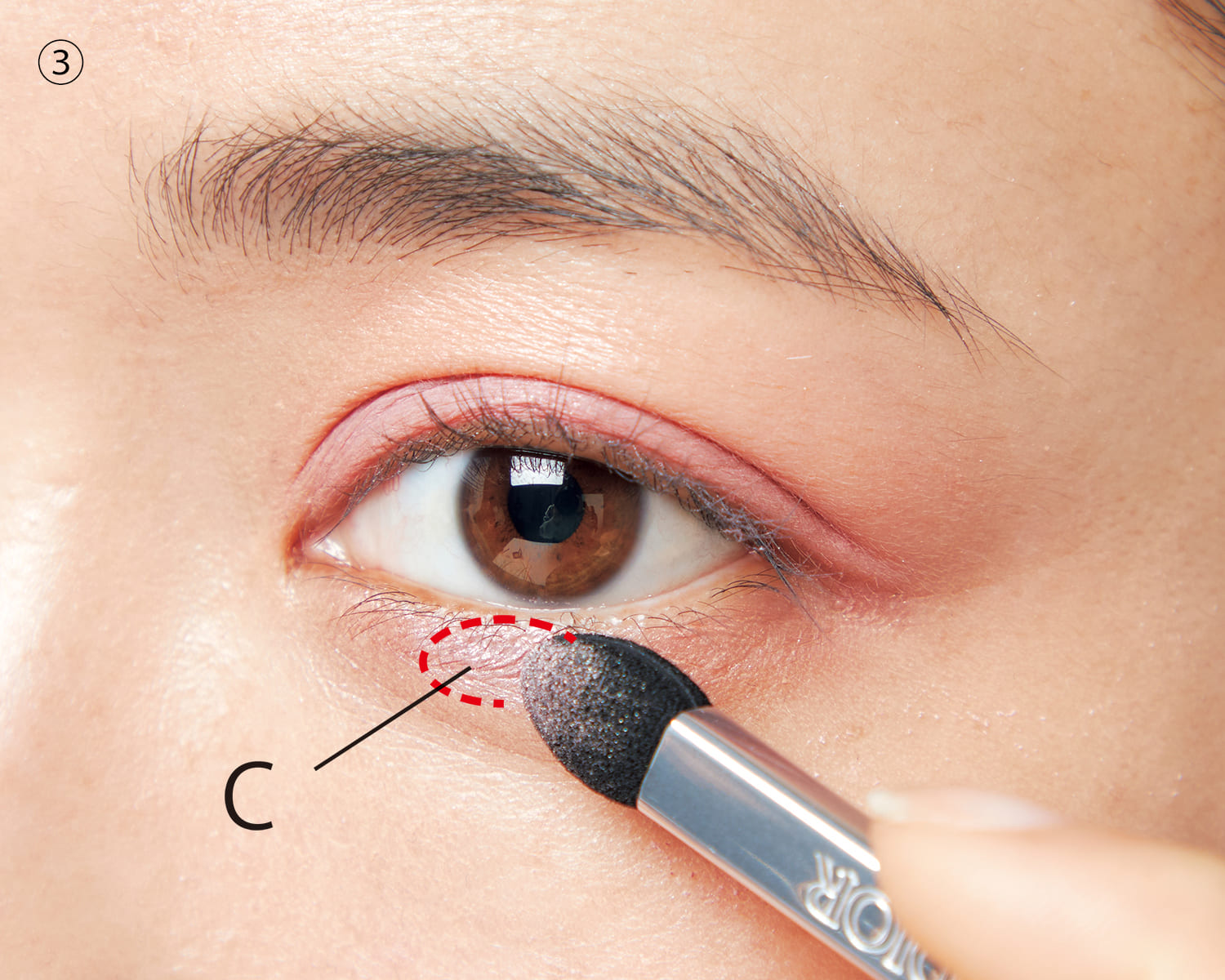 Cをチップに取り、下まぶた中央に黒目幅で入れる。白目の濁りを取り、ハリを出す効果が。