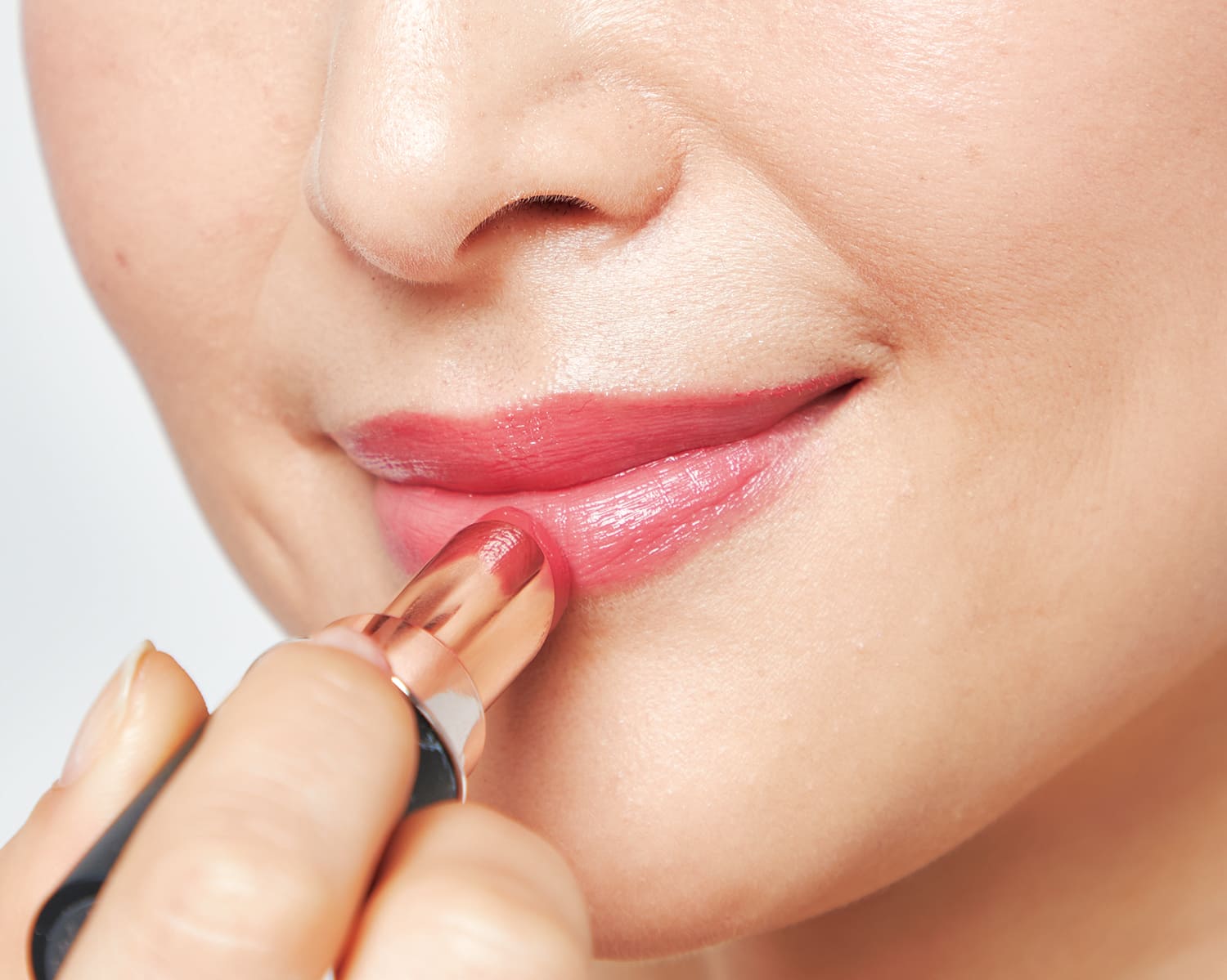 透け発色のツヤリップは、輪郭の内側にしっかりと直塗りして、色とツヤでハリを出す。