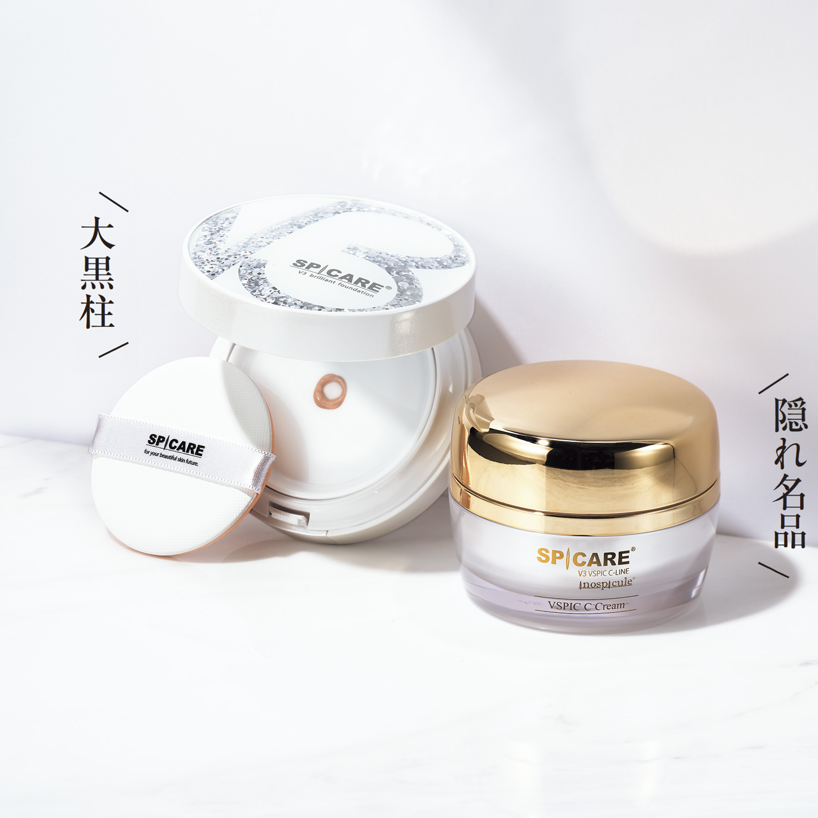 左から:大人気V3ファンデの超密着ふわふわマットバージョン。お馴染みとなったNMNをファンデに配合。ダイヤモンドコーティングしたイノスピキュールがハリと透明感をUPし華やかな肌印象へ。 V3 ブリリアント ファンデーション SPF40・PA++ ¥9,350、軽やかでベタつかないのに翌朝までしっとり感が持続するクリーム。寝ている間にナイアシンアミドやハマスゲ根エキスなどがくすみやシワにアタック。V3 VSPIC C クリーム 50ml¥11,000(ともにスピケア)