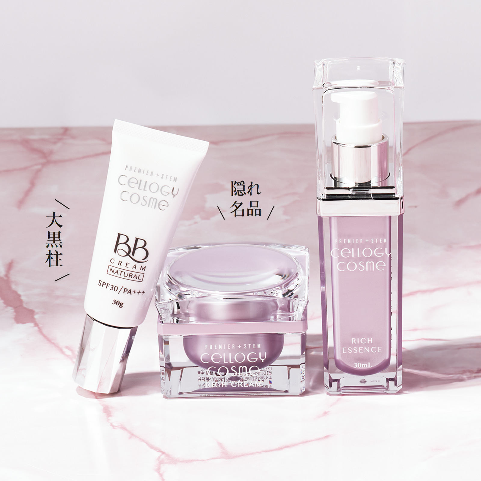 ナノリポソーム化されたヒト幹細胞エキスをシリーズ全アイテムに1~5%配合。左から:美容液のようなBBクリーム。ヒト幹細胞エキス1.5%配合つけている間ずっとスキンケアしているような贅沢な使用感でリピート続出。 BB クリーム SPF30・PA+++ ¥5,500、コクのあるテクスチャーで美肌に整える高機能クリーム。ヒト幹細胞エキスをはじめ、保湿に欠かせないヒアルロン酸なども高配合。リッチクリーム 30g ¥11,000、ヒト幹細胞エキスを5%と高配合したリッチな美容液。リッチエッセンス 30ml ¥10,450 ( すべてセブンビューティー)