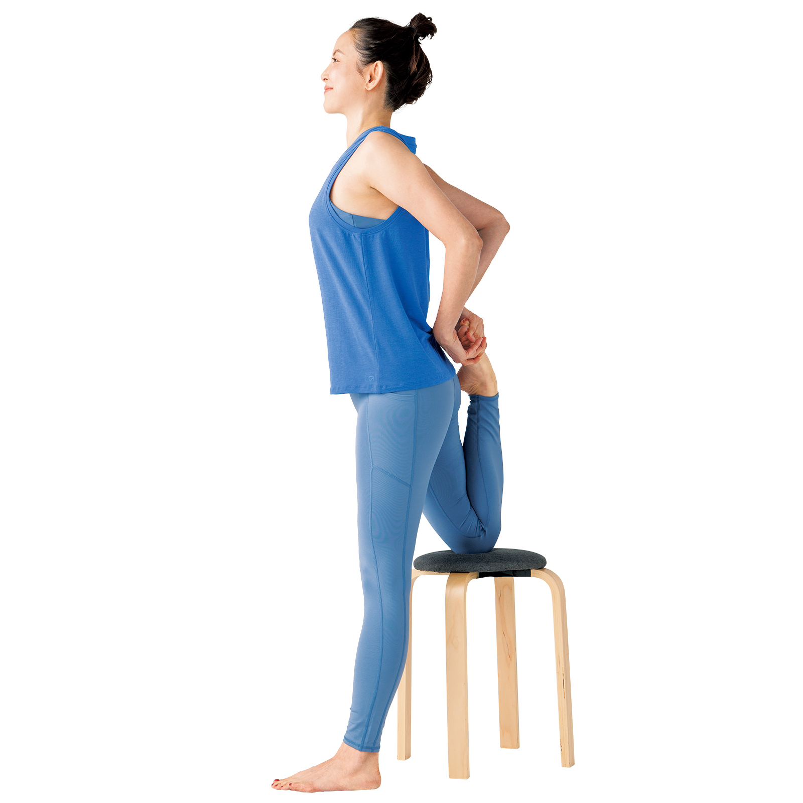 ②右足の親指を両手でつかみ、かかとがお尻につくよう膝を曲げ太ももを伸ばす。伸ばしている足は鼠蹊部を前方に突き出すようにし、目線は60°上を見る。1分間キープを左右行う。朝晩2回。膝が痛い場合はクッションなどを置いて。