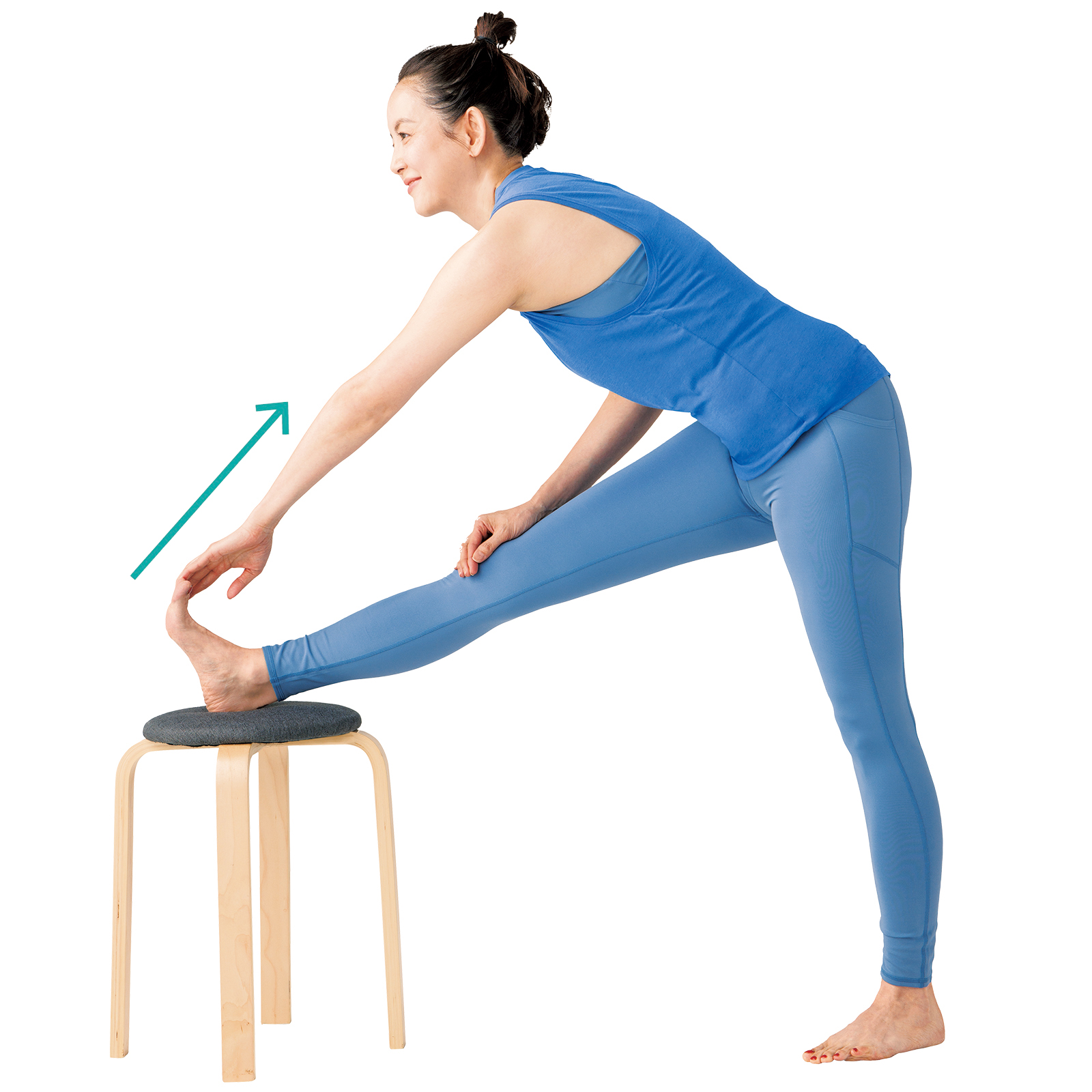 ①椅子を足の長さ分前方に離して置き、右足をのせる。背中が丸くならないよう、膝をしっかり伸ばし、足首を反らす。