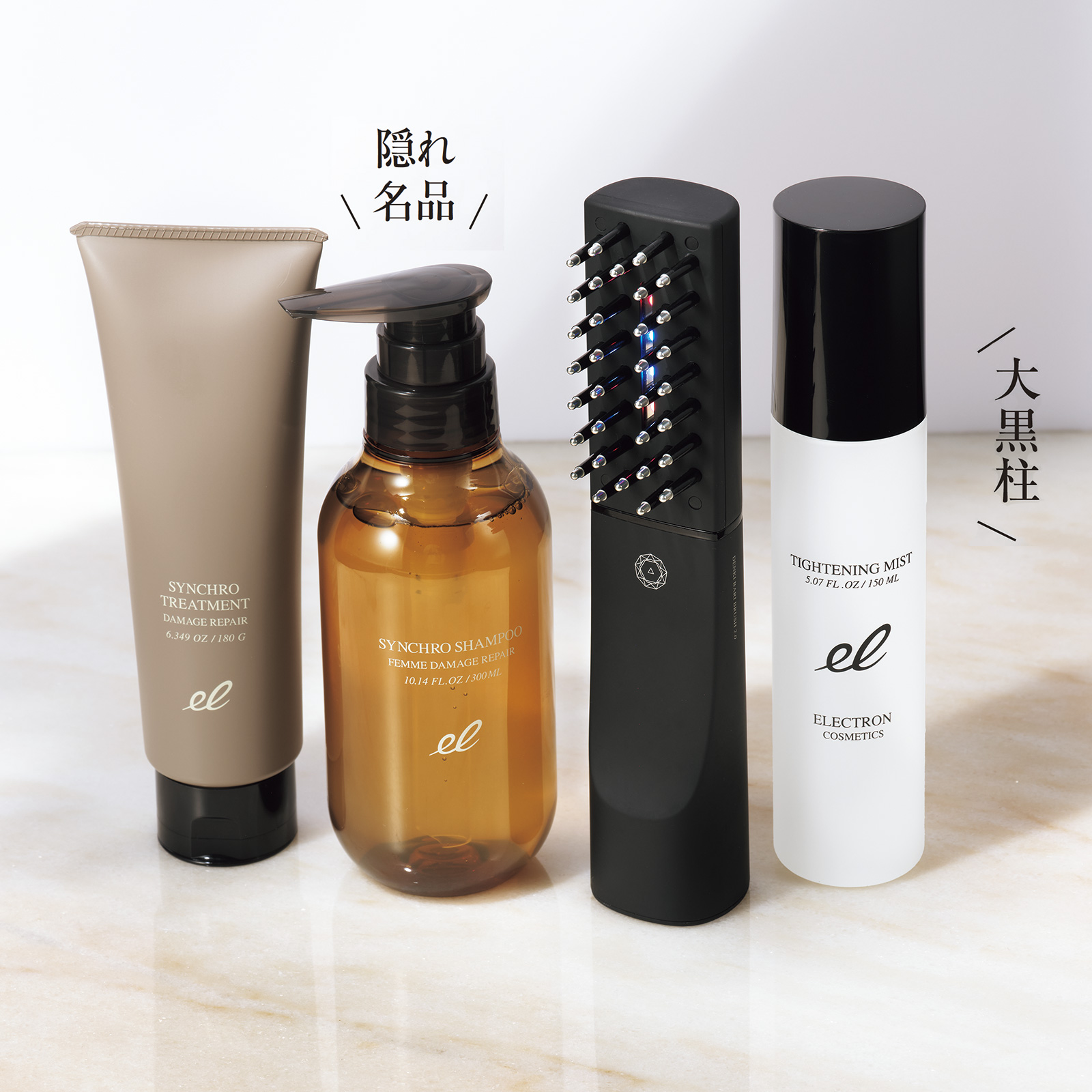 左から:活性電子水TMをベースに髪の空洞化に着目したダメージリペアシャントリ。今月号の増刊&特別版の付録でお試しできます。シンクロ トリートメント DAMAGE REPAIR 180g ¥3,080 シンクロシャンプー ファム DAMAGE REPAIR 300ml ¥3,740、ヘアメイクさんからも支持されるブラシ型の低周波美容機器。デンキバリブラシR 2.0 ¥179,300、美顔器をあてたような引き締まり感とハリ感を同時に叶えるミストタイプのローション。優れた皮膚浸透力を発揮する独自成分「活性電子水TM」をベース配合。本誌’24年7月号の付録になった新作・ブライトバージョンも人気爆発!タイトニングミスト 150ml ¥5,900(すべてGMコーポレーション)