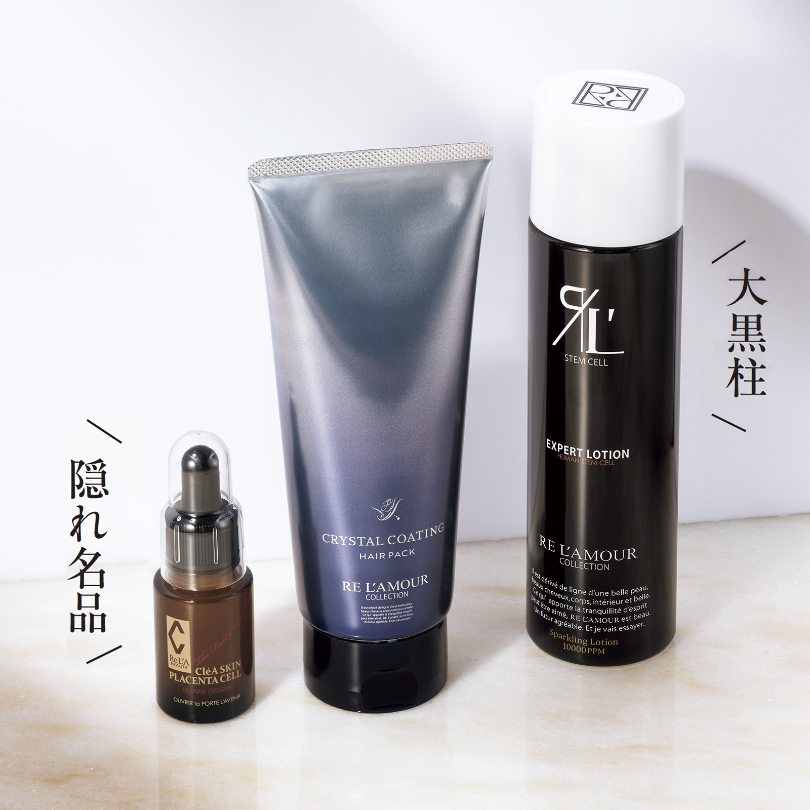 左から: ノーベル生理学・医学賞受賞の研究で注目されたLPSをはじめ、羊水幹細胞順化培養液をコレクション史上最高濃度配合。肌土台の底上げを実現。リアボーテ クレアスキン プラセンタセル 20ml ¥13,200、2種のケラチンとナノ化されたヘマチン、3種のヒト幹細胞培養液などを配合。髪のダメージ部分に吸着して乾燥を防止し補修を後押し。リアムール クリスタルコーティングヘアパック 180g ¥4,950、表皮・真皮・骨髄・臍帯血・脂肪幹細胞培養抽出液と植物幹細胞由来成分配合の機能型炭酸ローション。肌、頭皮、全身をうるおわせながら引き締め、血行促進と細胞の活性をサポート。同 エキスパートローション 150g ¥9,350(すべてボーテデラボ)