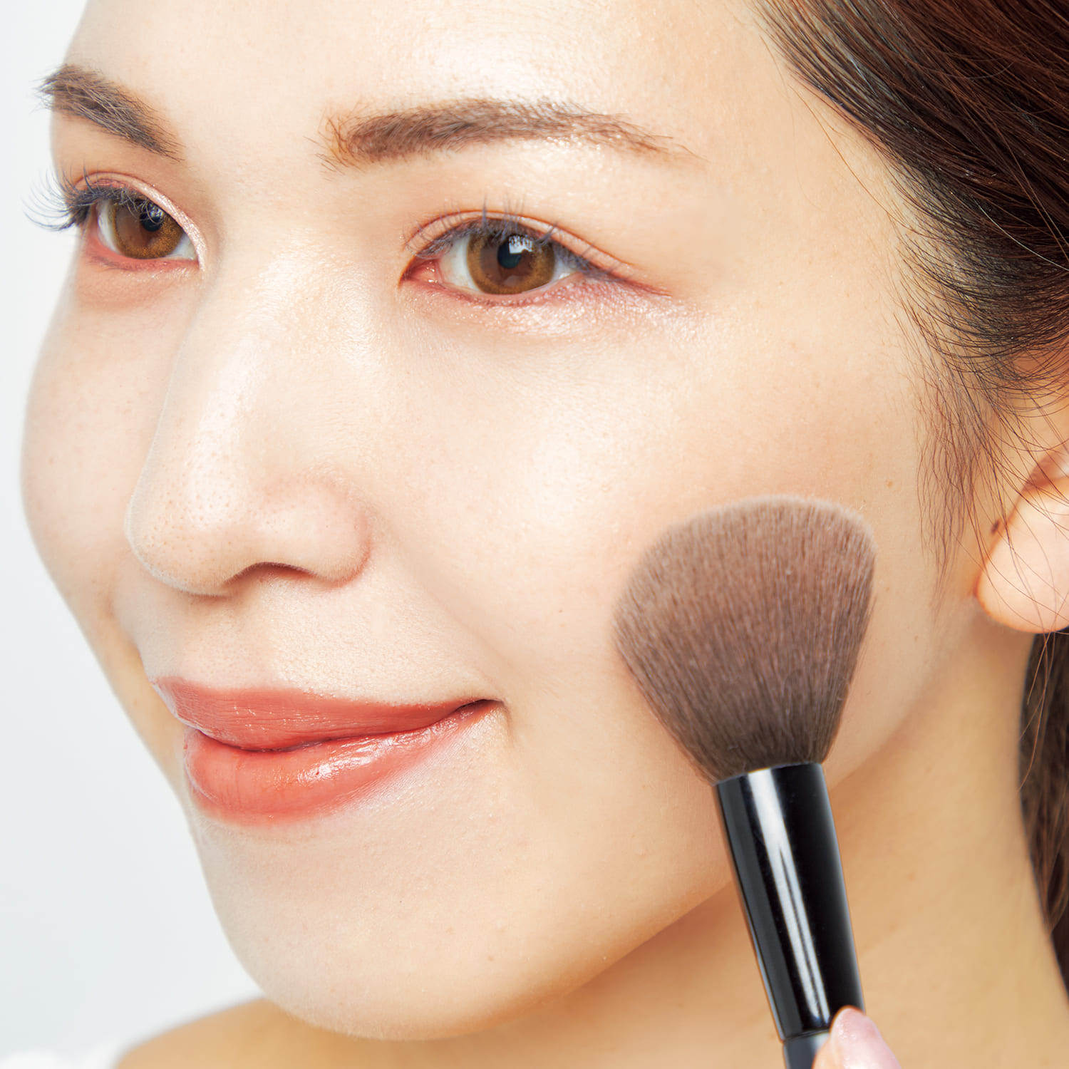 頰骨の下から外側にブラシでふわっと横向きに3のチークを入れると、フェイスラインが締まって見えリフトアップ効果も。