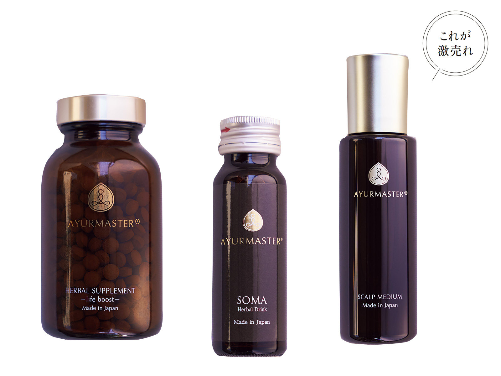 公式オンラインでも購入可能。左から:科学的に検証した40種の伝統ハーブをブレンド。ハーバルサプリメント ライフブースト 600錠¥19,440、老化防止と美容促進のための特許成分配合の飲むアーユルヴェーダ。老廃物や毒素を取り除き全身の細胞を活性化。ソーマ ハーバルドリンク 50ml ¥3,240、特許成分配合の頭皮と髪のエイジングケア美容液。スカルプメディウム 125ml ¥16,500(すべてAYURMASTER)
