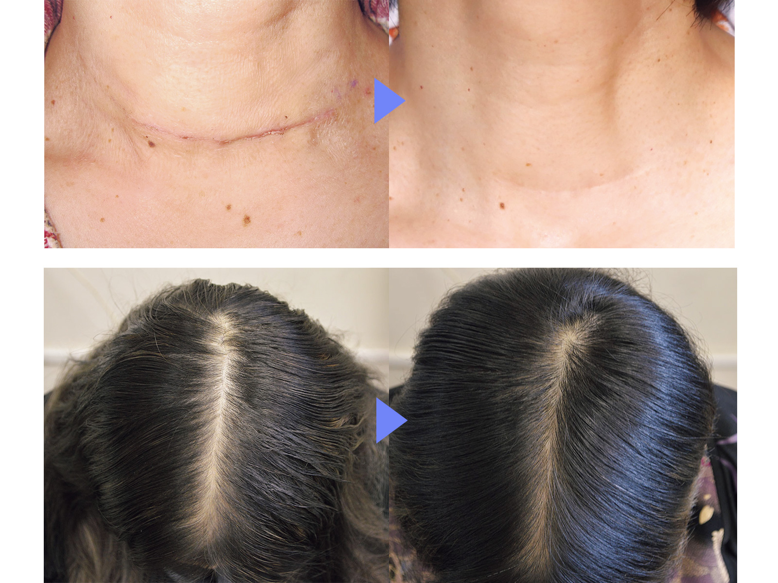 成分研究の実証写真がこちら。上は首元の手術痕がキレイに。下は50歳女性の頭皮にAyucelraTM-SCという成分を塗布した実験。4カ月後のアフターは頭頂部の毛量の違いが一目瞭然。