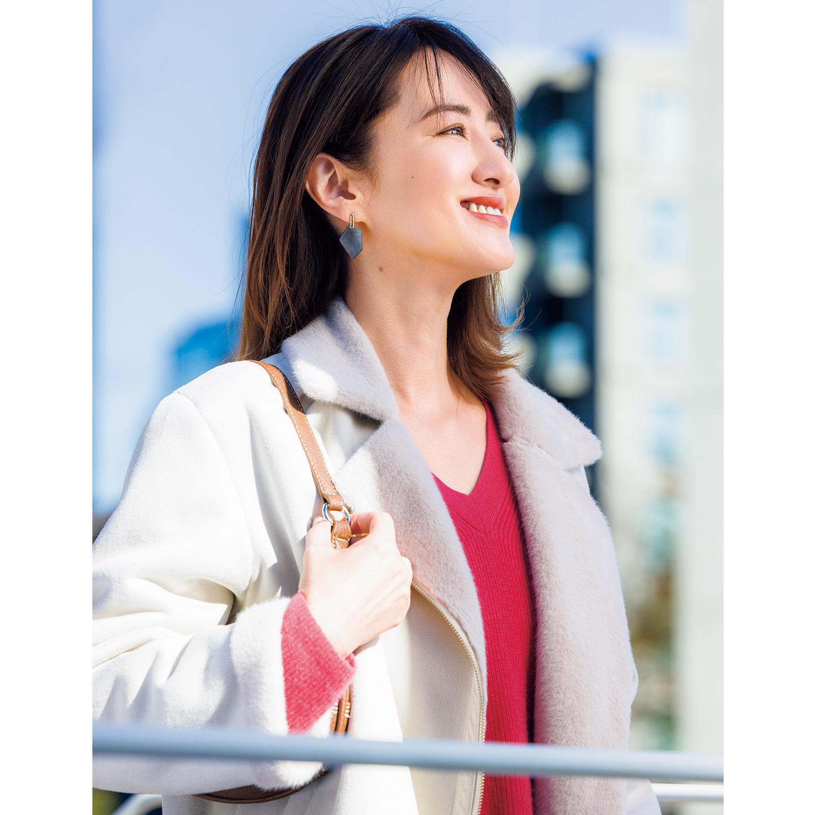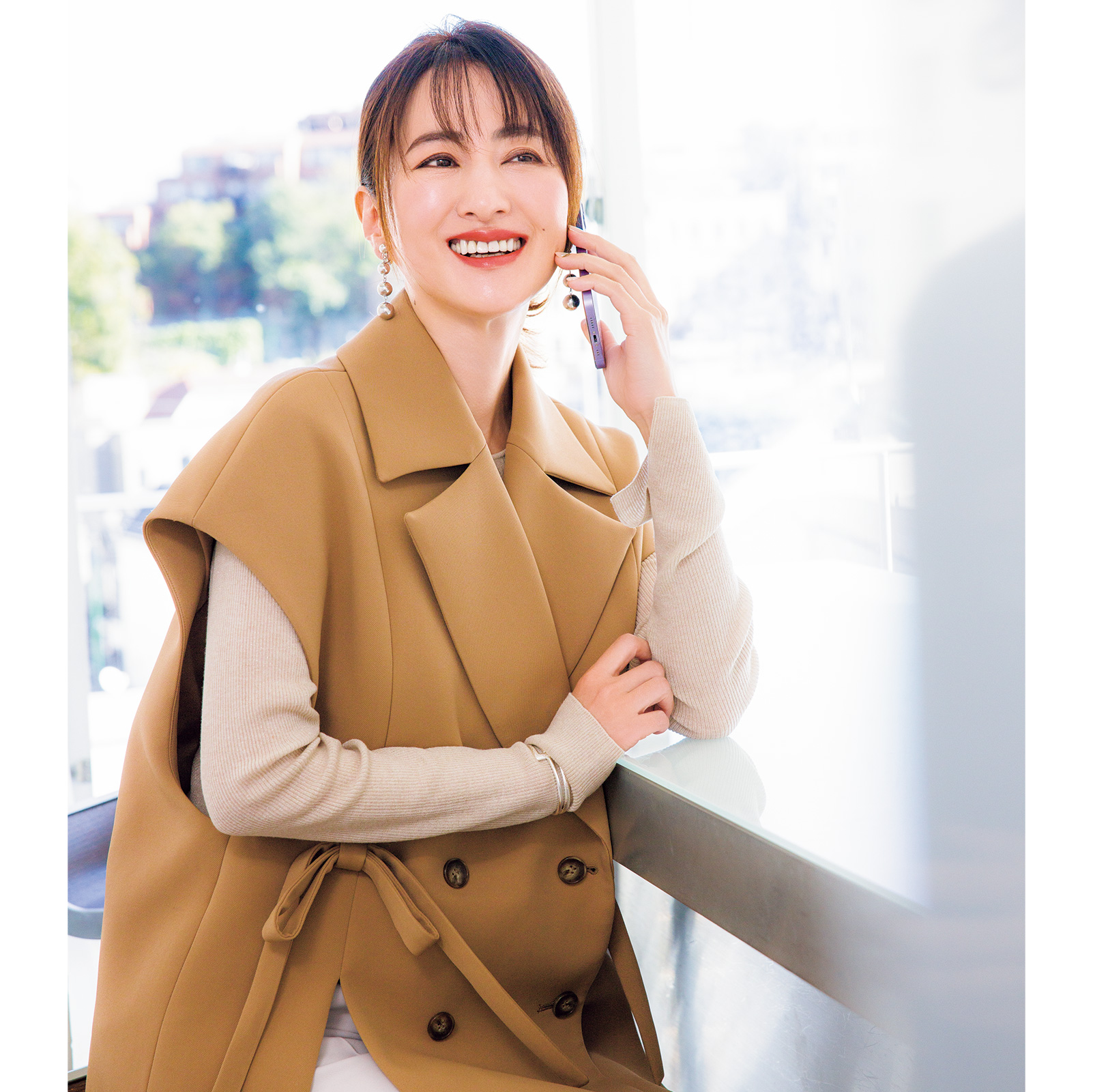 ジレ¥39,600(アルページュストーリーオリジナル/アルページュストーリーオリジナル プレスルーム)ニット¥14,960(インディヴィ/ワールド プレスインフォメーション)パンツ¥14,300(ステートオブマインド/ゲストリスト)イヤリング¥6,480バングル¥4,620(ともにアビステ)