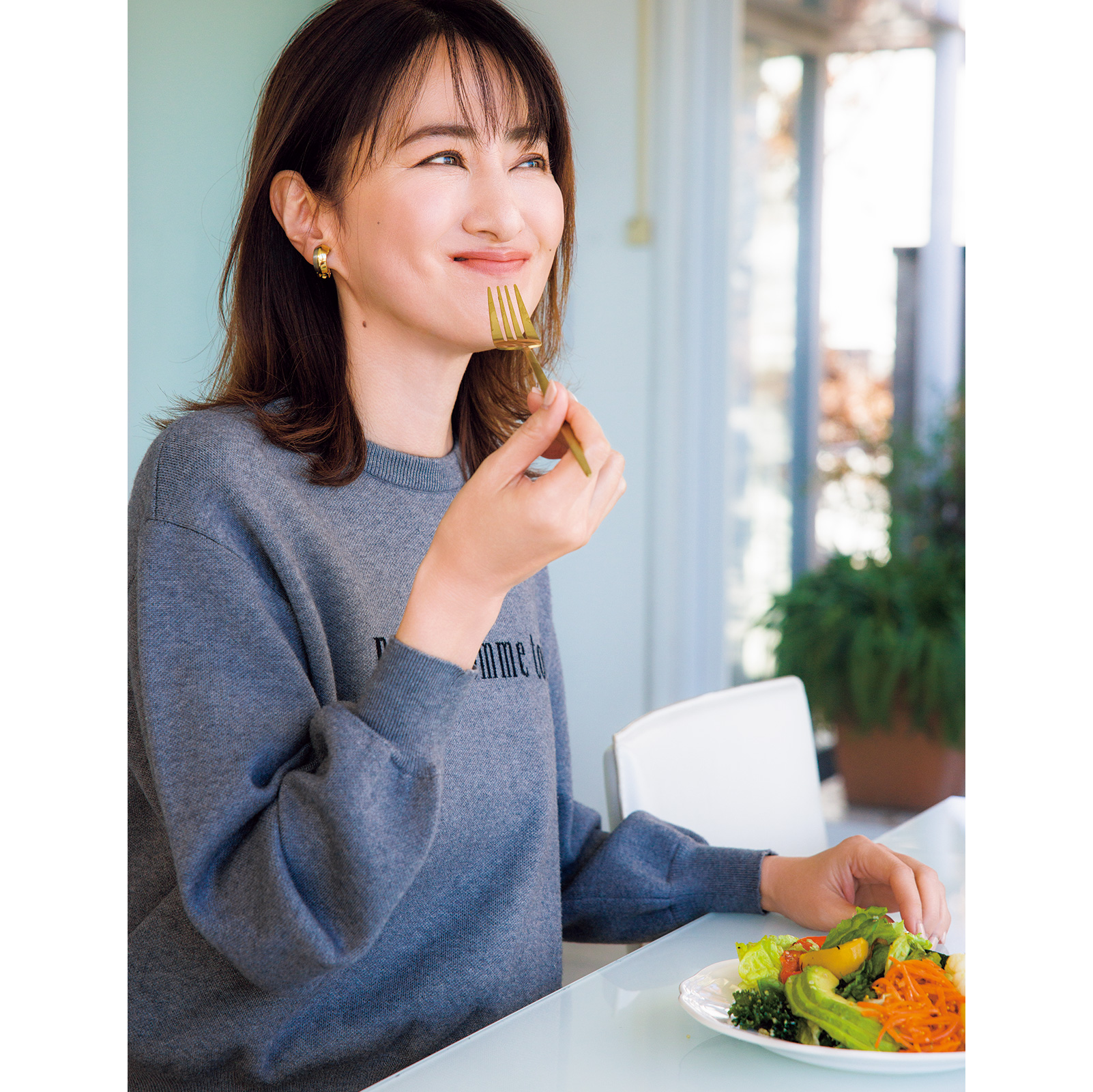 ご飯を早食いしていると、顔は下向きになりがち。前を向いてゆっくり噛んで食べるクセをつけましょう。ゆっくり噛むと、凝り固まった首周りの筋肉がほぐれて正しい位置に戻しやすくなります。