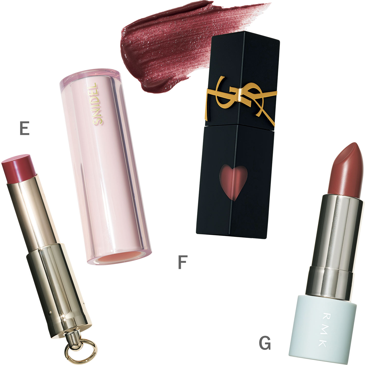 今季の濃いめブラウンは血色が滲み出るシアーな発色のものが豊富だから、くすまずに品の良い口元を演出してくれます。ビビッドな赤よりもトープなニュアンスでおしゃれ感と色っぽさも忍ばせられる、大人にこそふさわしいカラーです。