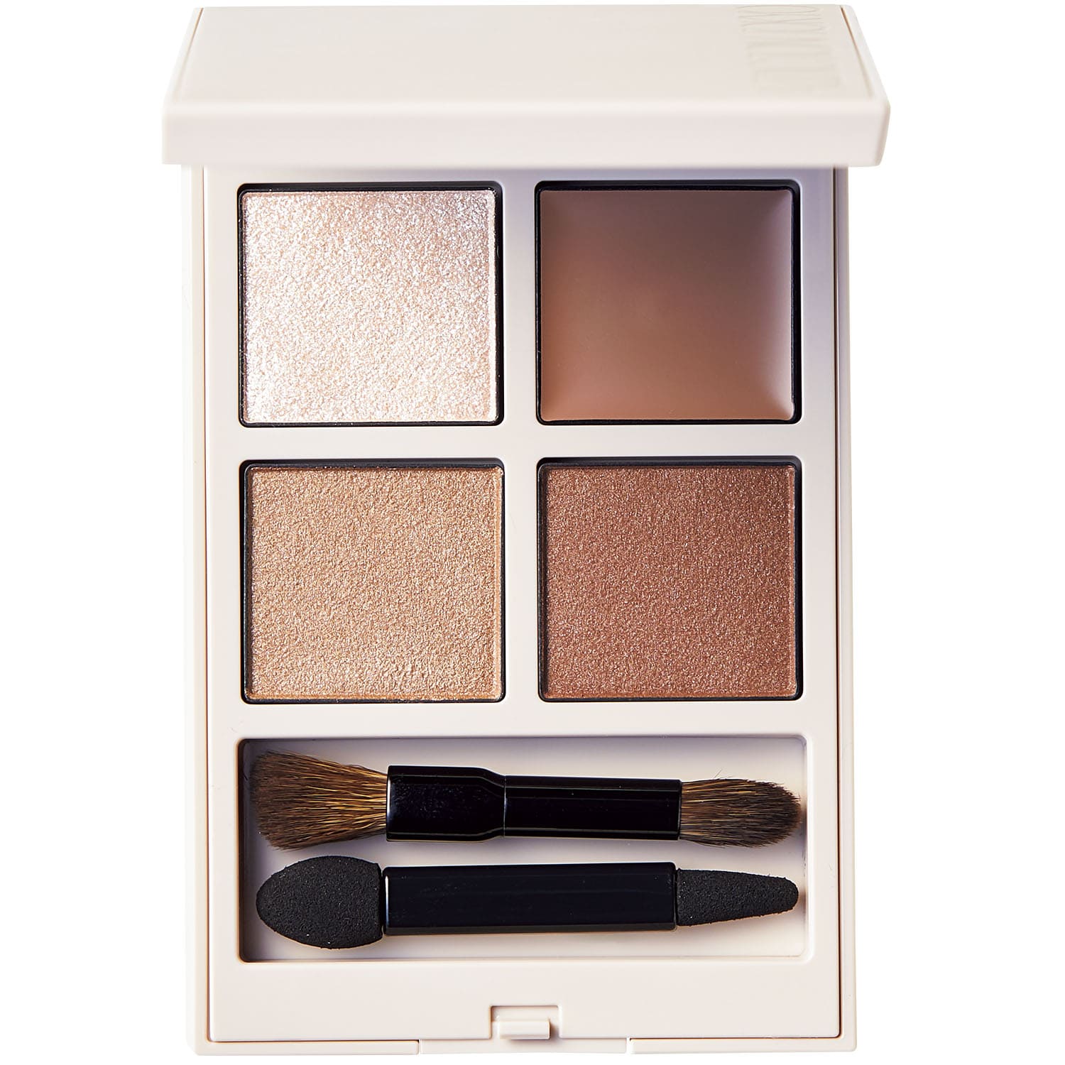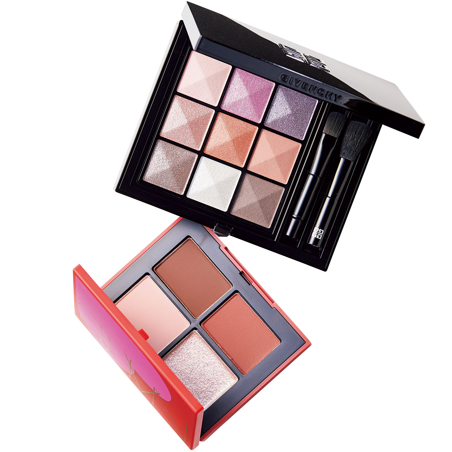 上:モデル使用色。肌馴染みの良い9色。ル・ヌフ・ジ バンシイ 15 ¥8,360 ※限定発売(パルファム ジバンシイ)下:ラメ、マットと異なる質感をセット。クワッド アイシャドー 04016 ¥7,150 ※限定発売(NARS JAPAN)