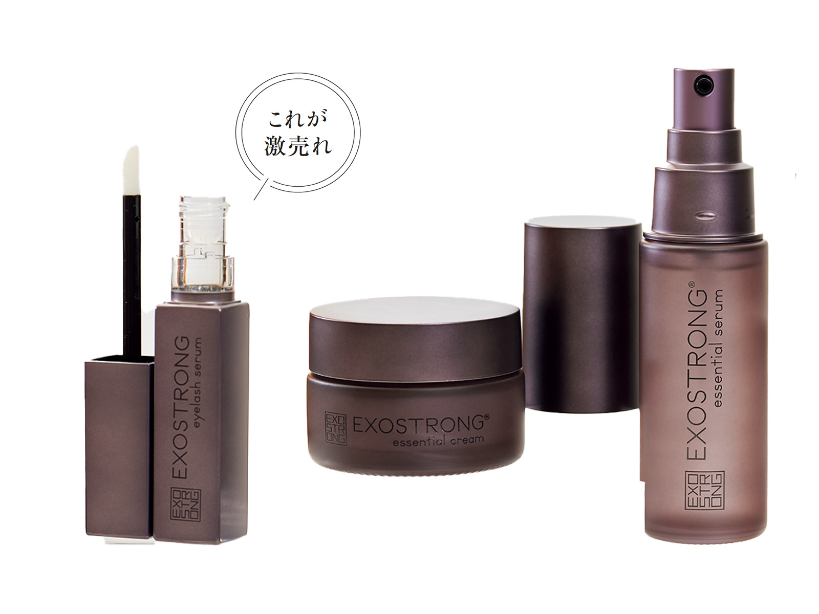 国から許可を受けたセルソース再生医療センター独自開発成分をはじめ、純国産のヒト幹細胞順化培養液やエクソソーム配合の「エクソストロング」を開発。左から:敏感な目元にこだわった処方。まつ毛の内部と表面にWアプローチ。エクソストロング® アイラッシュセラム 3ml ¥9,680、とろけるように馴染み、ゆらぎがちな肌をサポート。同 クリーム 30g ¥17,600、うるおいのヴェールで肌を包みキメの整ったハリ感が。同 エッセンシャルセラム 30ml ¥16,500(すべて滝川)
